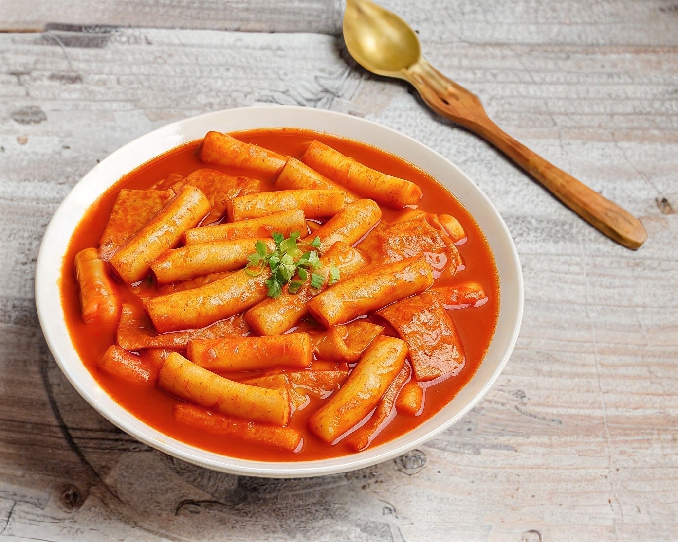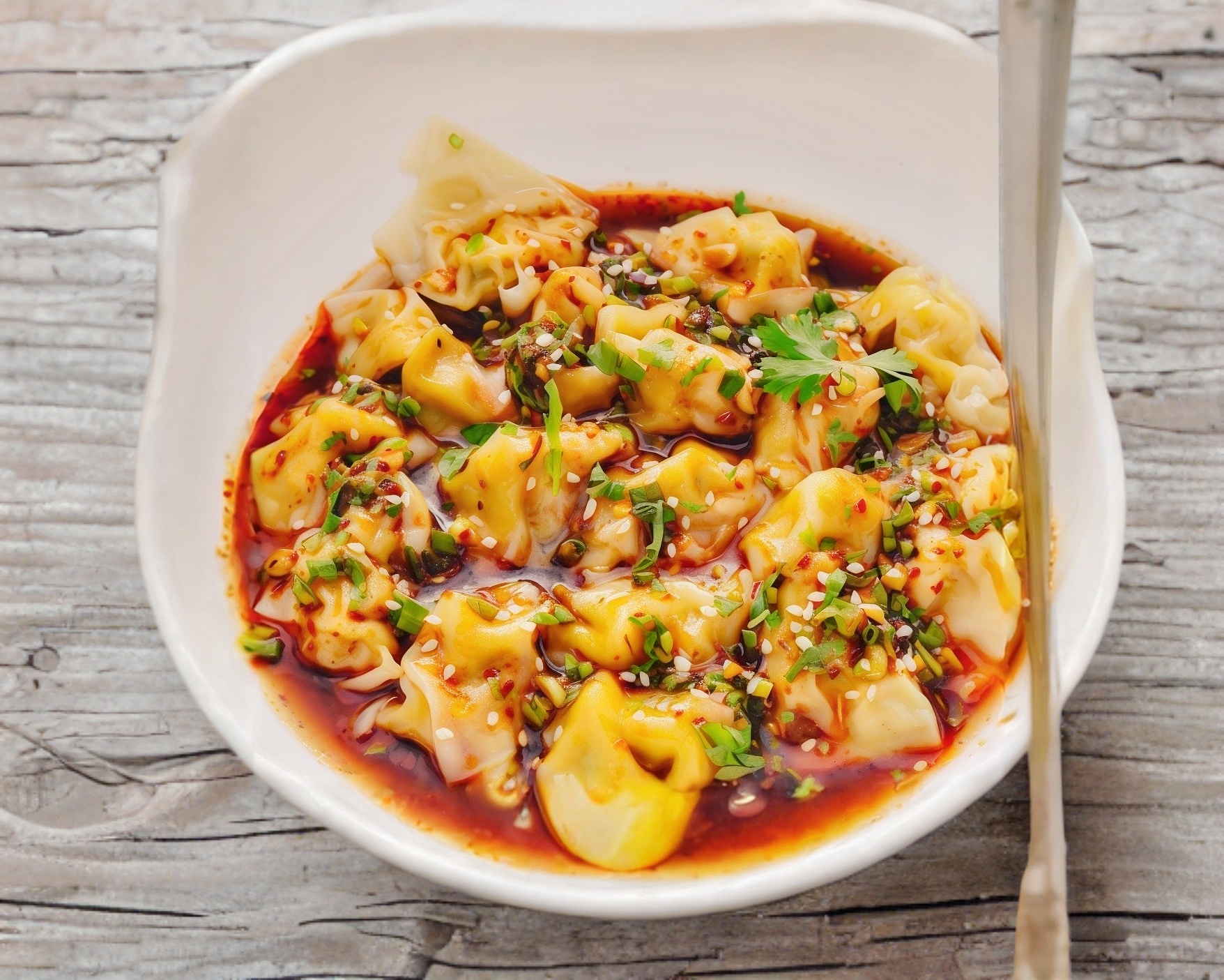 Picante mandu sisheuan, pasta de arroz, wontong rellenas de pollo.
