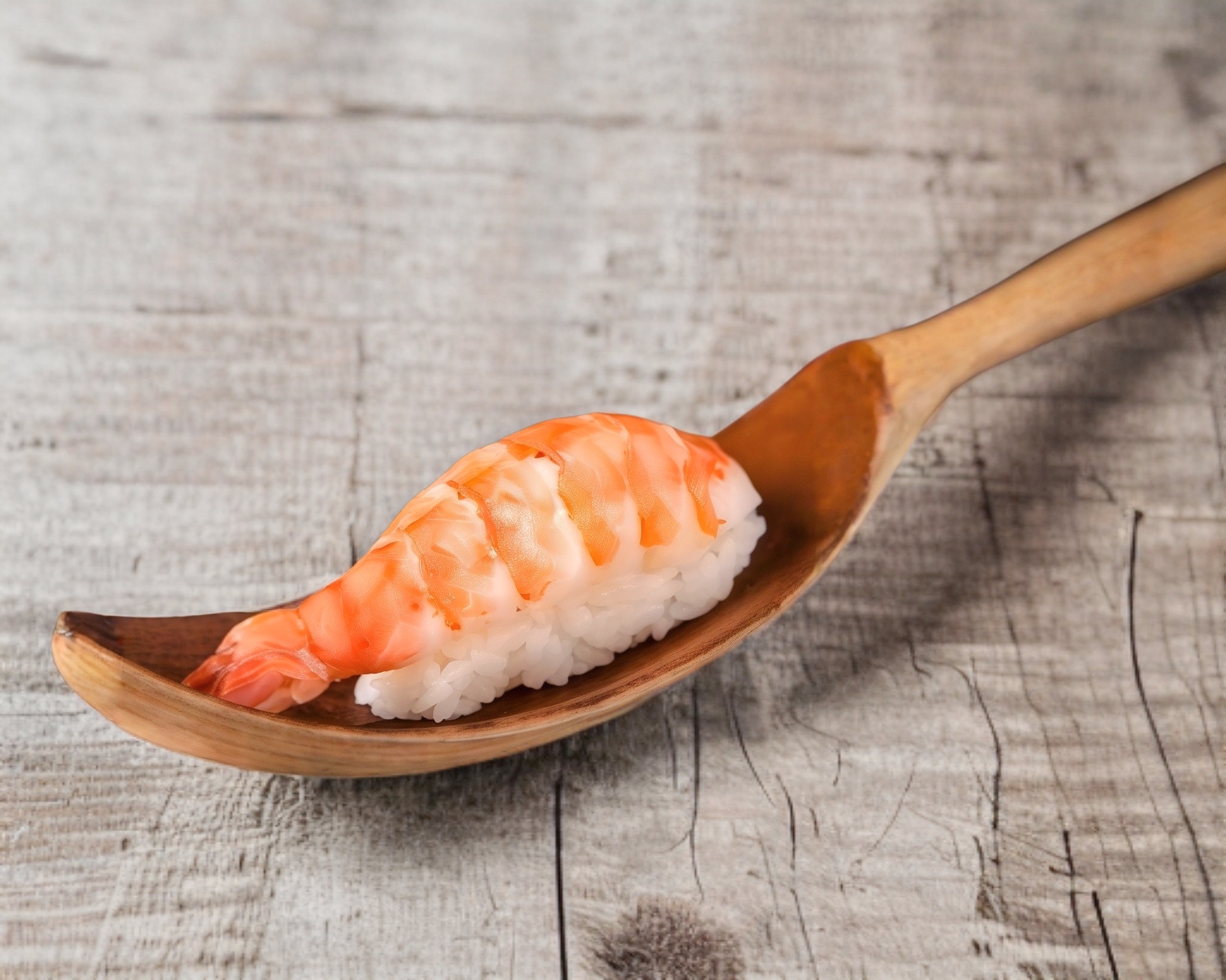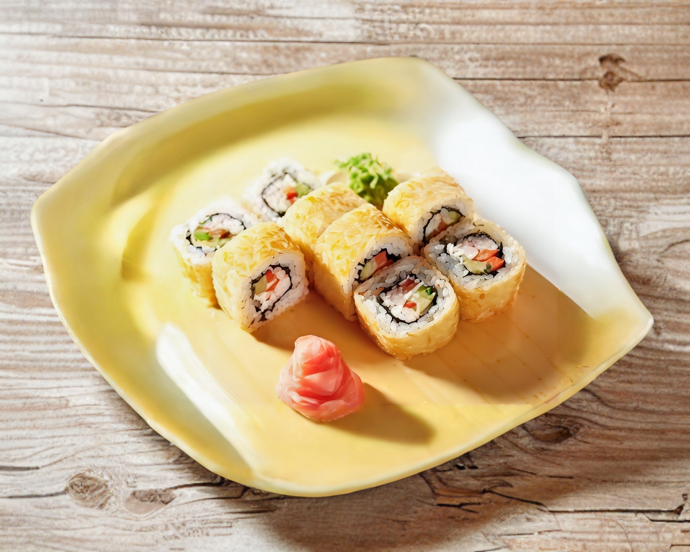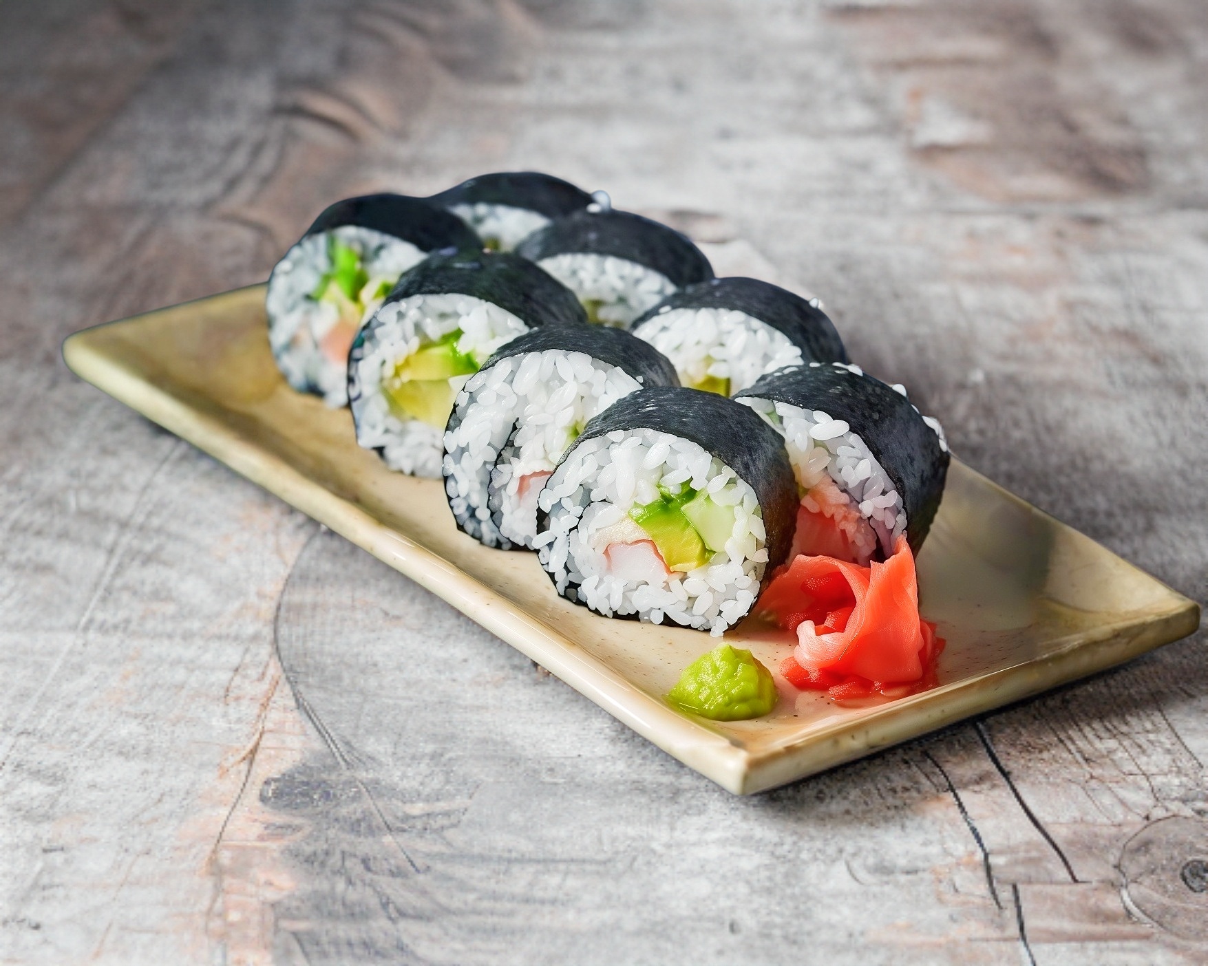 8 bocados de sushi con arroz, alga, Camarón o surimi, zanahoria, calabaza, salsa de soya picosa o agridulce