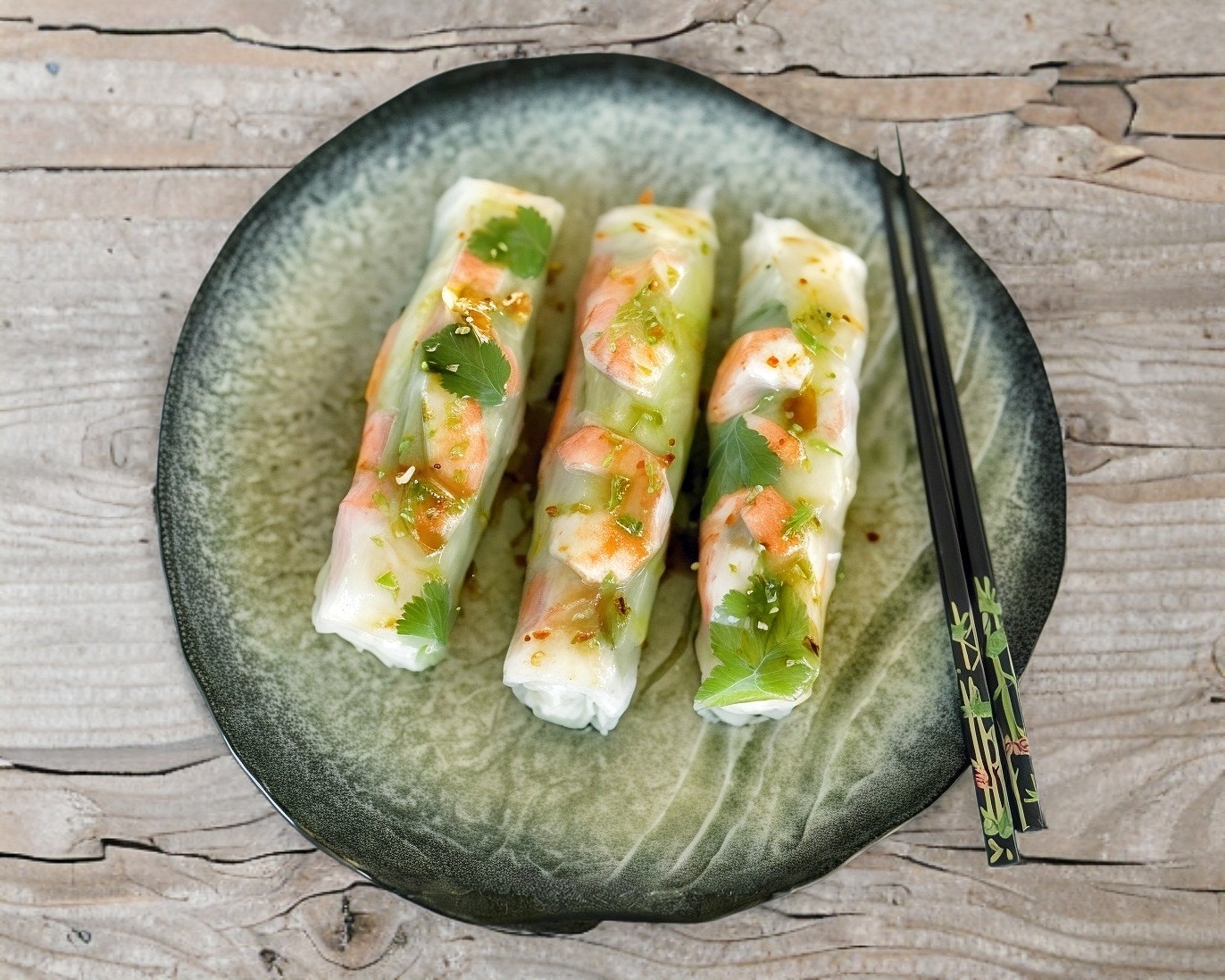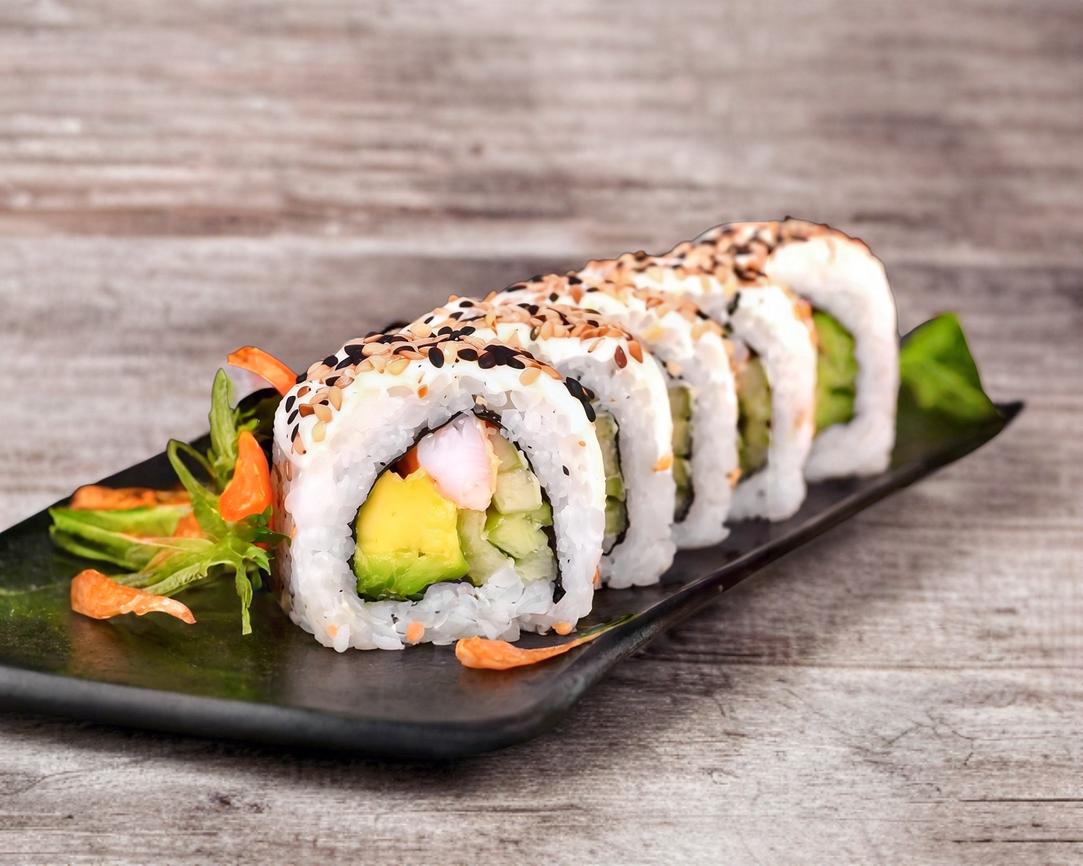 Camarón o surimi acompañados de aguacate, germen de trigo, pepino y philadelphia.