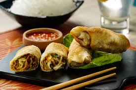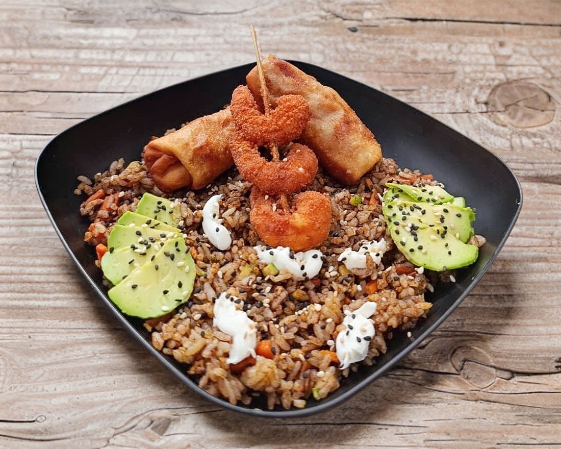 Arroz frito, con brochetas de camarón, rollos primavera y 2 refrescos de la familia aga. Para dos personas.