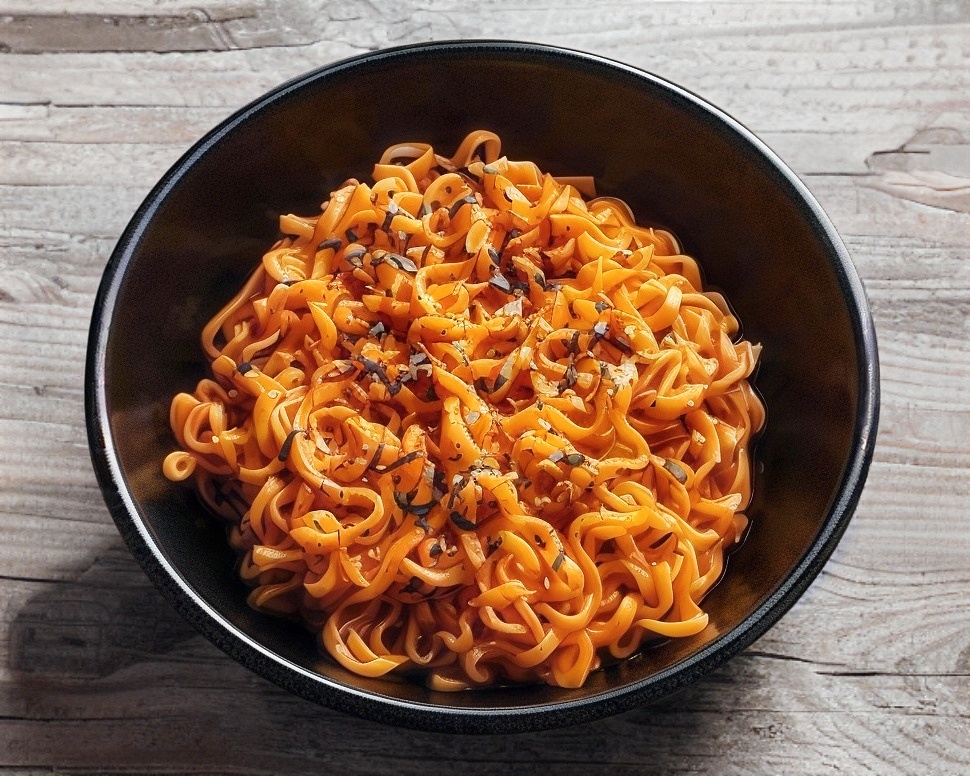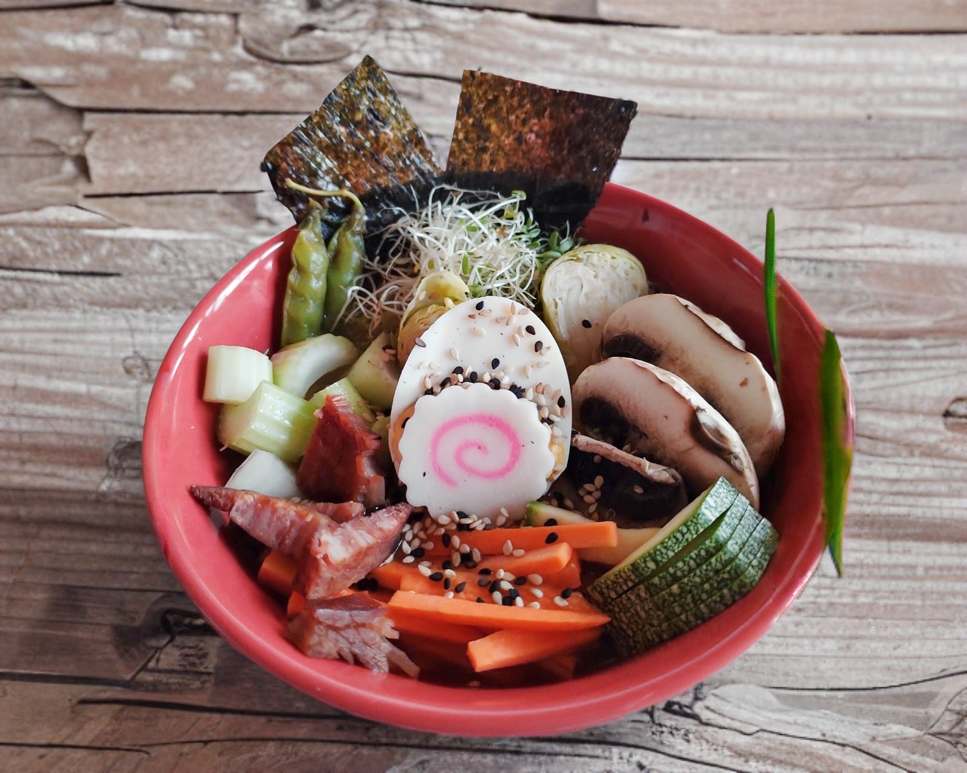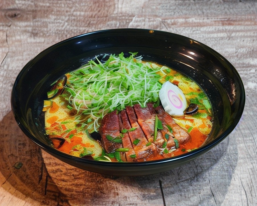 Pasta gruesa de arroz, acompañada de soya, proteína huevo zuke tamago y cebollín.