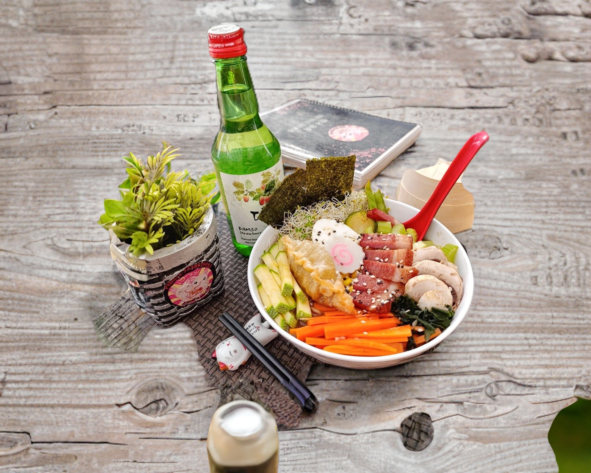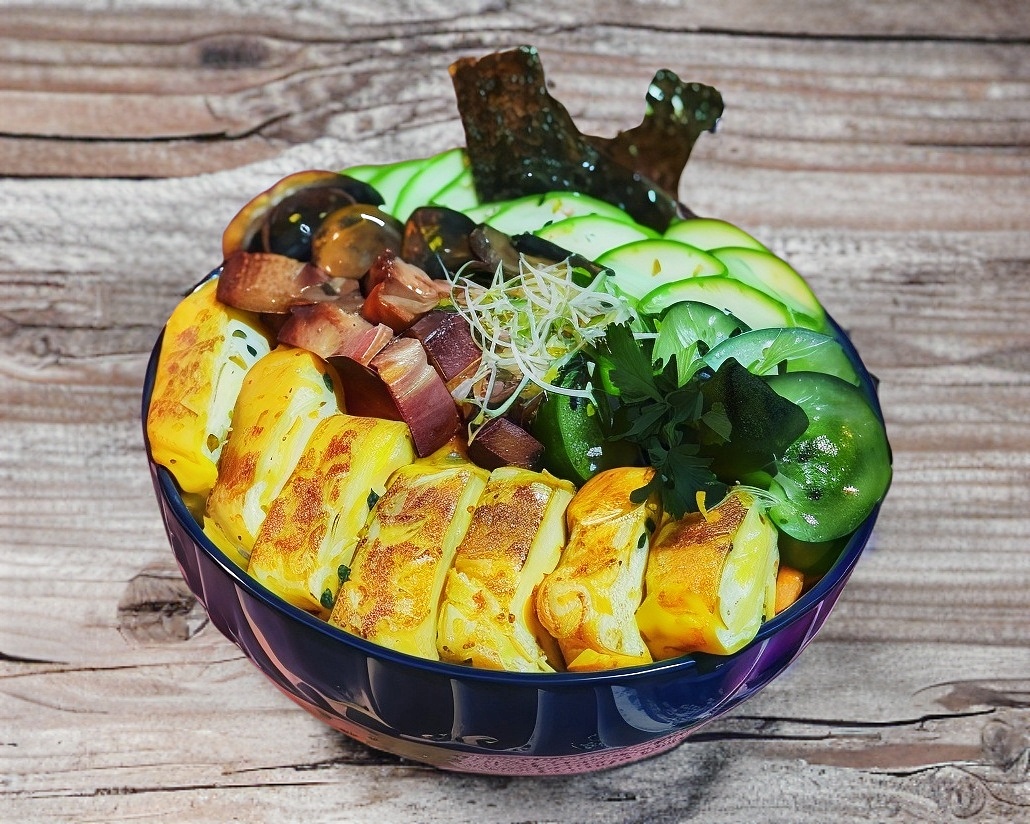 Arroz blanco con verdura, kimchi tamagoyaki o tamago cocido.