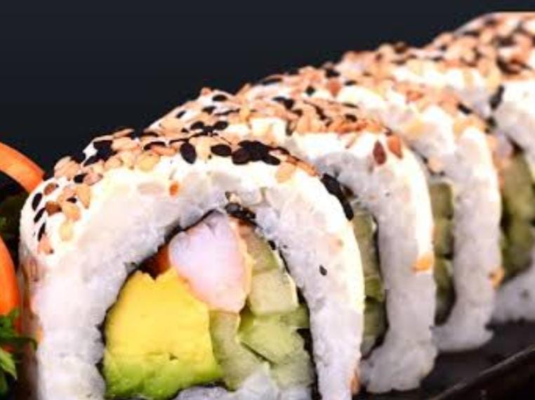 8 bocados de sushi con arroz, alga, philadelphia, pepinillo, aguacate, camarón y salsa de soya picosa o agridulce