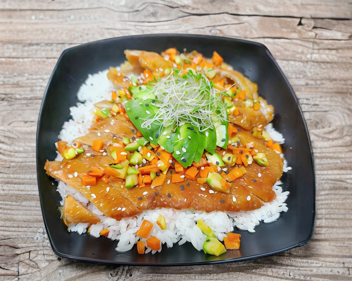 Proteína tocineta, acompañada con una gyoza de carne y vegetales y huevo.