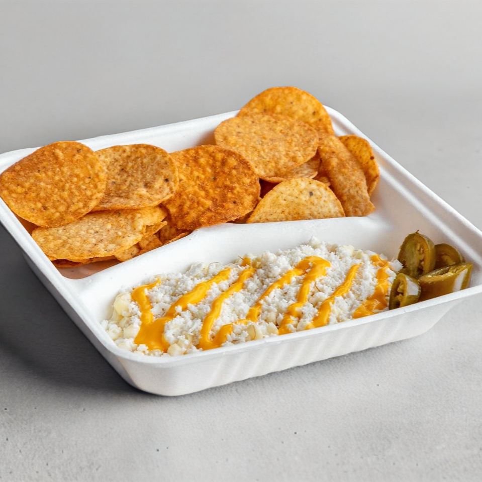 Exquisito Elote entero o rebanado, cubierto de Mayonesa y Fritura de Ruffles acompañado de aderezo chipotle y cacahuate