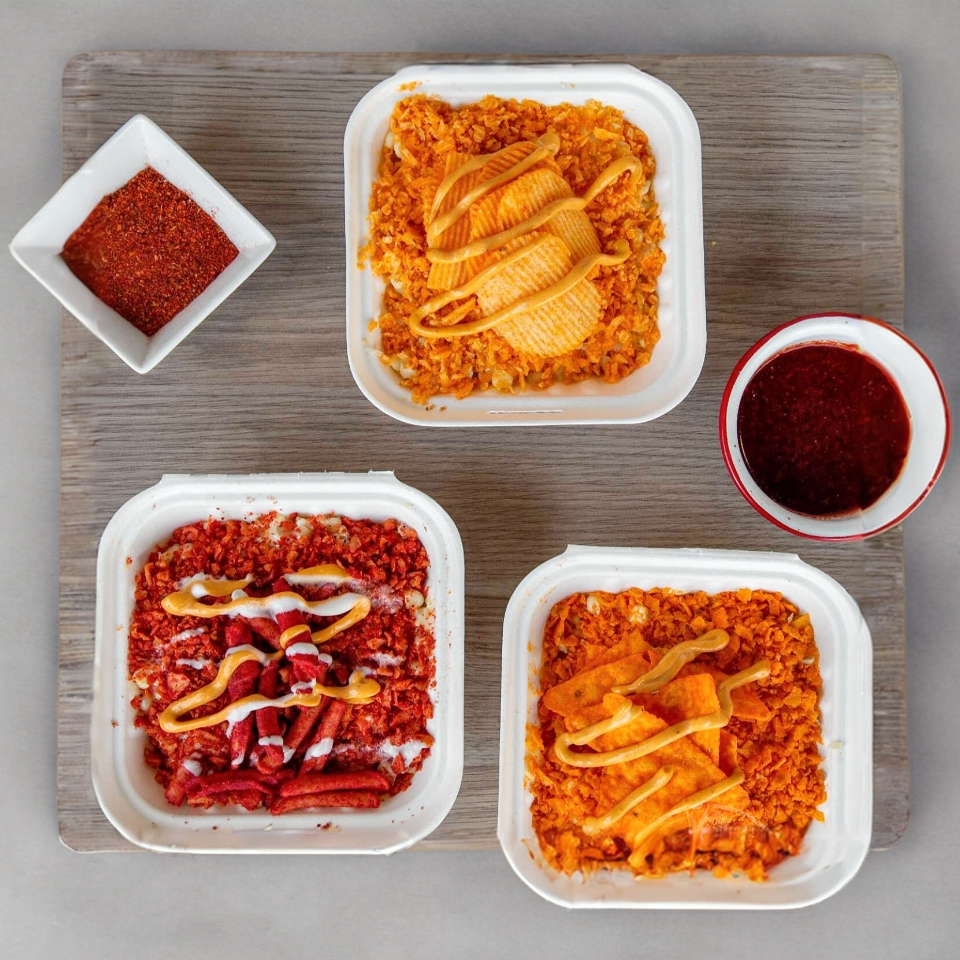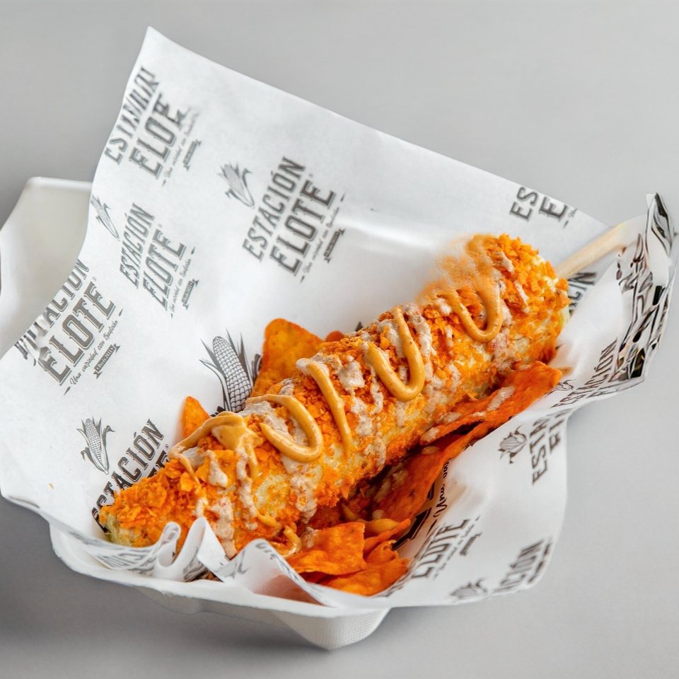 Exquisito Elote entero o rebanado, cubierto de Mayonesa y Fritura de Takis de Barcel acompañado de crema y aderezos de nuestra casa.