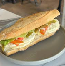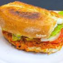 Lonche (en birote), de pollo desmenuzado a la plancha. Lleva jitomate, chile, aguacate, cebolla y preparado de crema en las tapas.