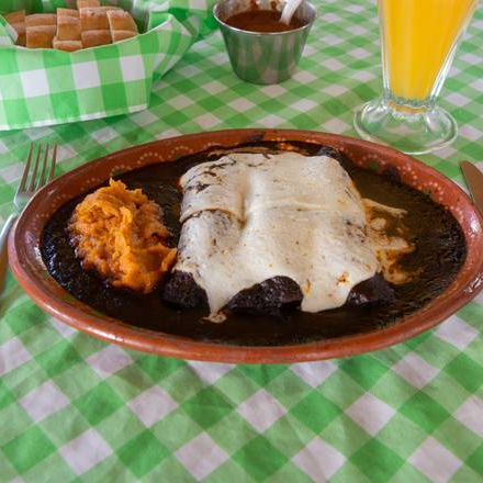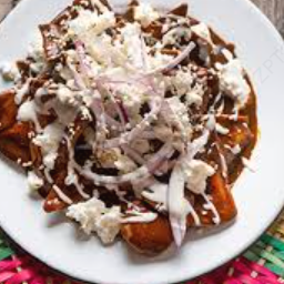 Totopos caseros bañados de mole poblano, cebolla, queso y crema. Acompañado de frijoles y bolillo.