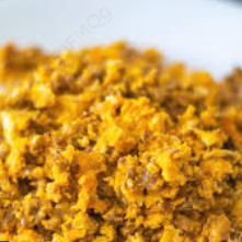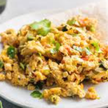 Huevo revuelto guisado con cebolla, jitomate y chile verde picado. Va acompañado de frijoles y bolillo.