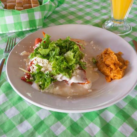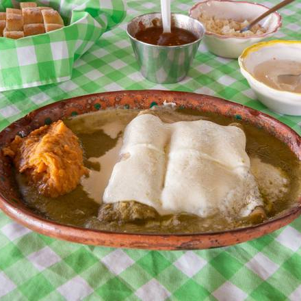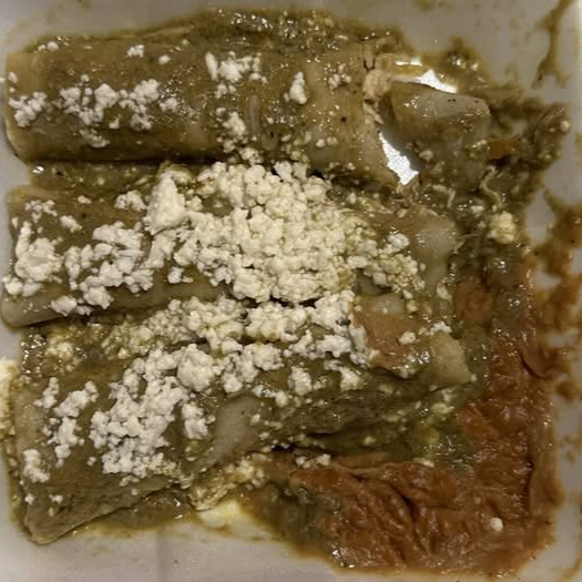 Enmoladas verdes rellenas de pollo con un exquisito toque de queso gratinado y crema. Van acompañadas de frijoles refritos y bolillo.