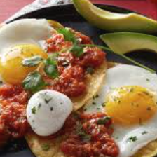 Par de huevos estrellados servidos sobre dos tortillas fritas y bañados en salsa de jitomate. Va acompañado de frijoles y bolillo.