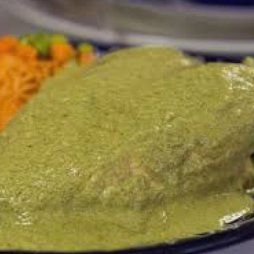 Ricas enchiladas, rellenas de pollo, bañadas en un suculento mole preparado con hierbas que le dan ese característico color verde. Va acompañado con frijoles refritos y bolillo.