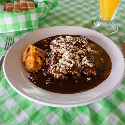 Las clásicas enchiladas rellenas de pollo y bañadas en un mole poblano, cuya receta lleva más de 32 ingredientes y se ha pasado de generación en generación desde 1890. Van acompañadas de frijoles refritos y bolillo.