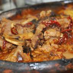 Arrachera picada y guisada en salsa picante. Acompañada de tortillas y frijoles.
