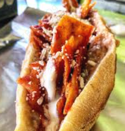 Lonche (en telera) de pancita de cerdo frita guisada en salsa roja. Lleva cebolla y frijoles refritos en las tapas.