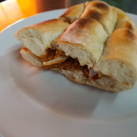 Lonche (en birote), con rica pierna adobada. Lleva aguacate, cebolla, chile, jitomate y aderezo de crema en las tapas.