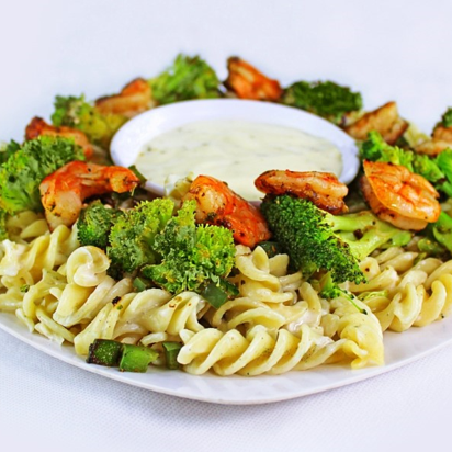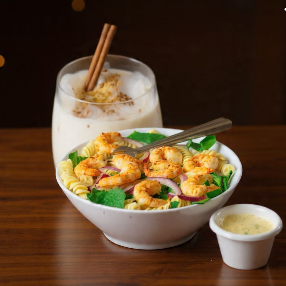 Pasta fusili, camarón, espinacas, cebolla morada y aderezo.