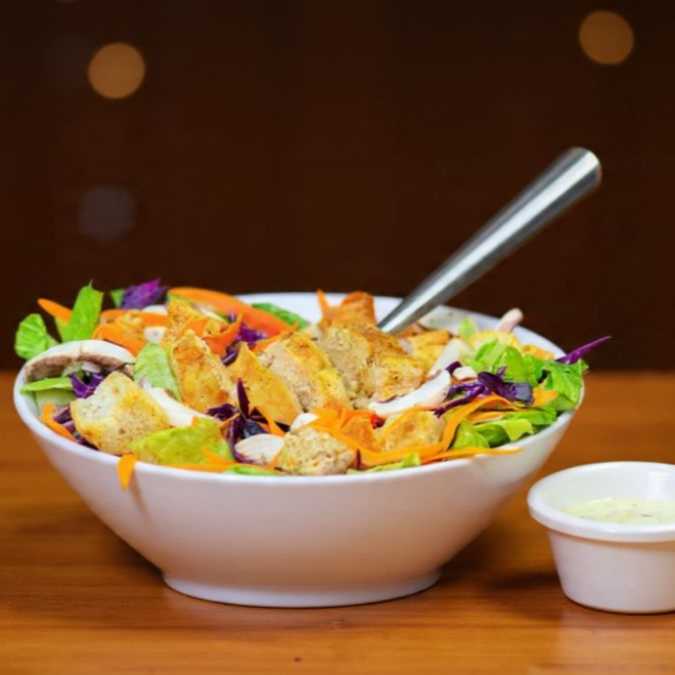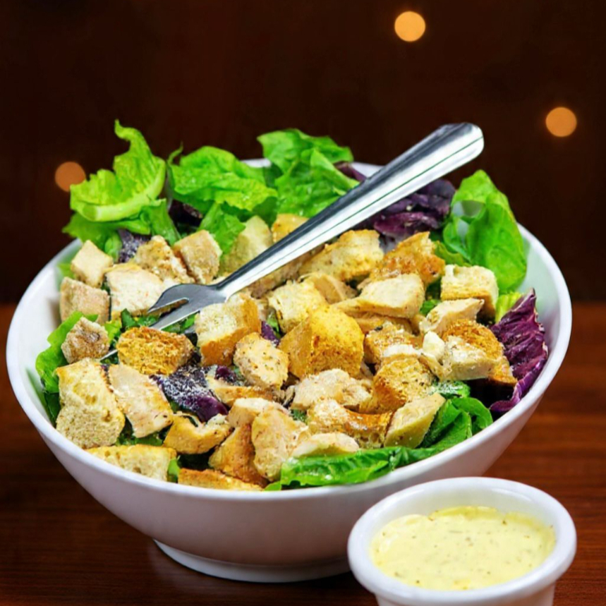 Con pollo a la plancha, queso parmesano, crotones, lechugas mixtas y aderezo.