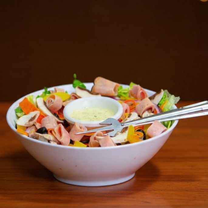 Con jamón selva negra, aceituna negra, zanahoria, cebolla morada, champiñones, pimiento morrón y aderezo.