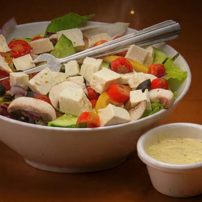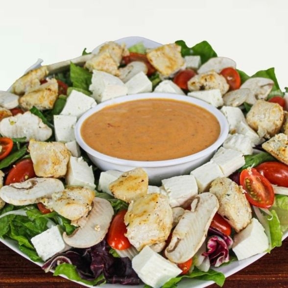 Pollo, panela, champiñones, cebolla morada, jitomate cherry, lechugas mixtas y aderezo.