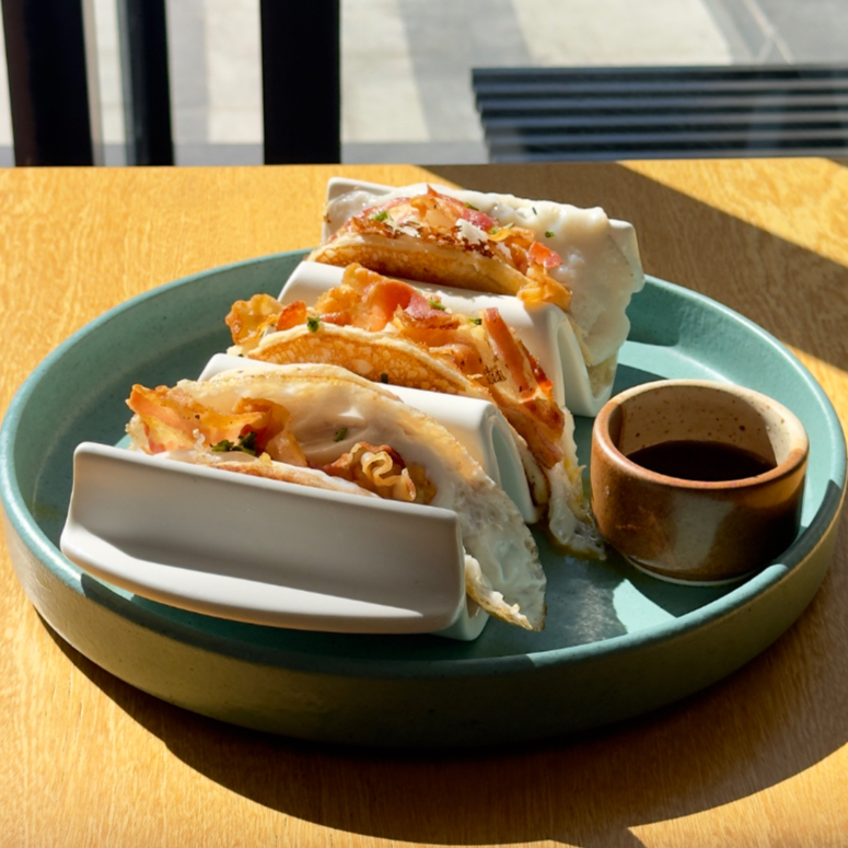 Tradicional desayuno americano hecho taco; 3 piezas de esponjosos hot cakes, queso amarillo, huevo estrellado, tocino y mapple + Cafe americano (especialidad Veracruz) a un super precio.