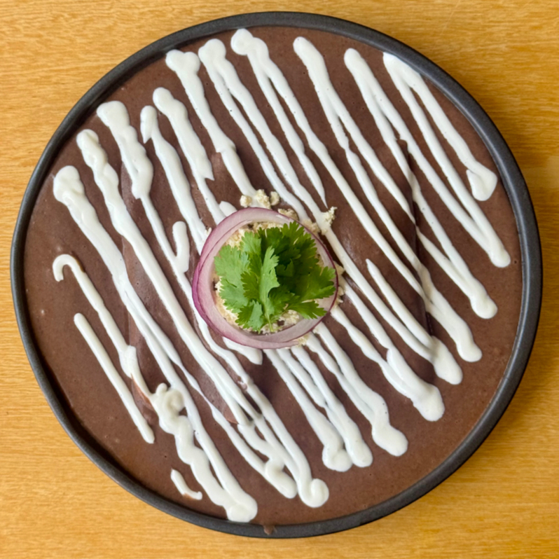 Deliciosa y cremosa salsa de frijol negro con un toque de chipotle. Coronada con crema, queso fresco, cebolla y cilantro. Relleno a su elección de queso o pollo.