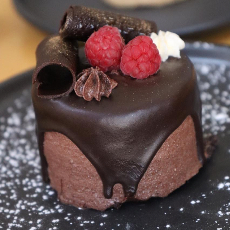 Pan de chocolate con un toque de queso, coronado con cajeta y chocolate.