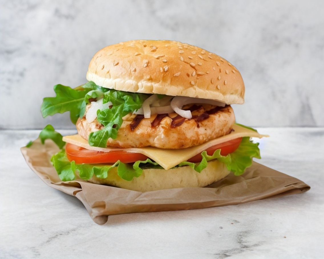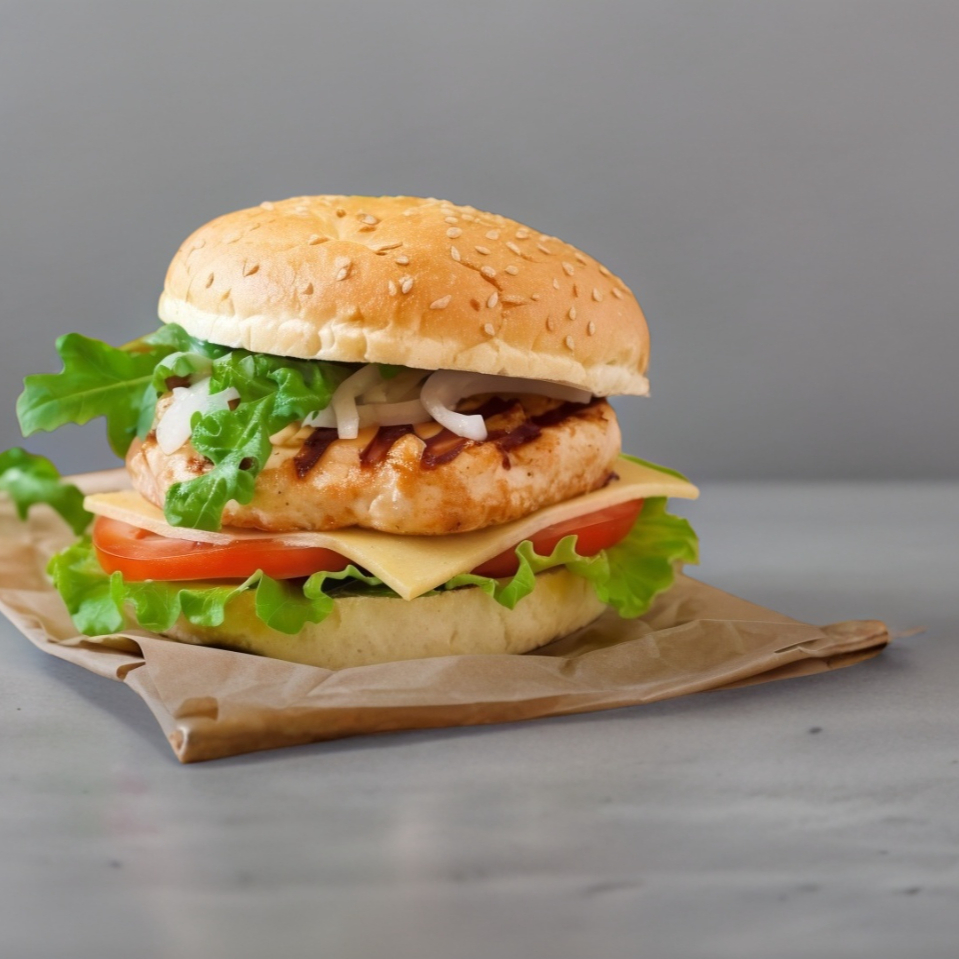 Hamburguesa de Pollo a la Plancha Con pan artesanal suave y doradito, pechuga de pollo a la plancha bien jugosa, lechuga fresca, jitomate, cebolla, aderezo cremoso y un toque de mostaza.