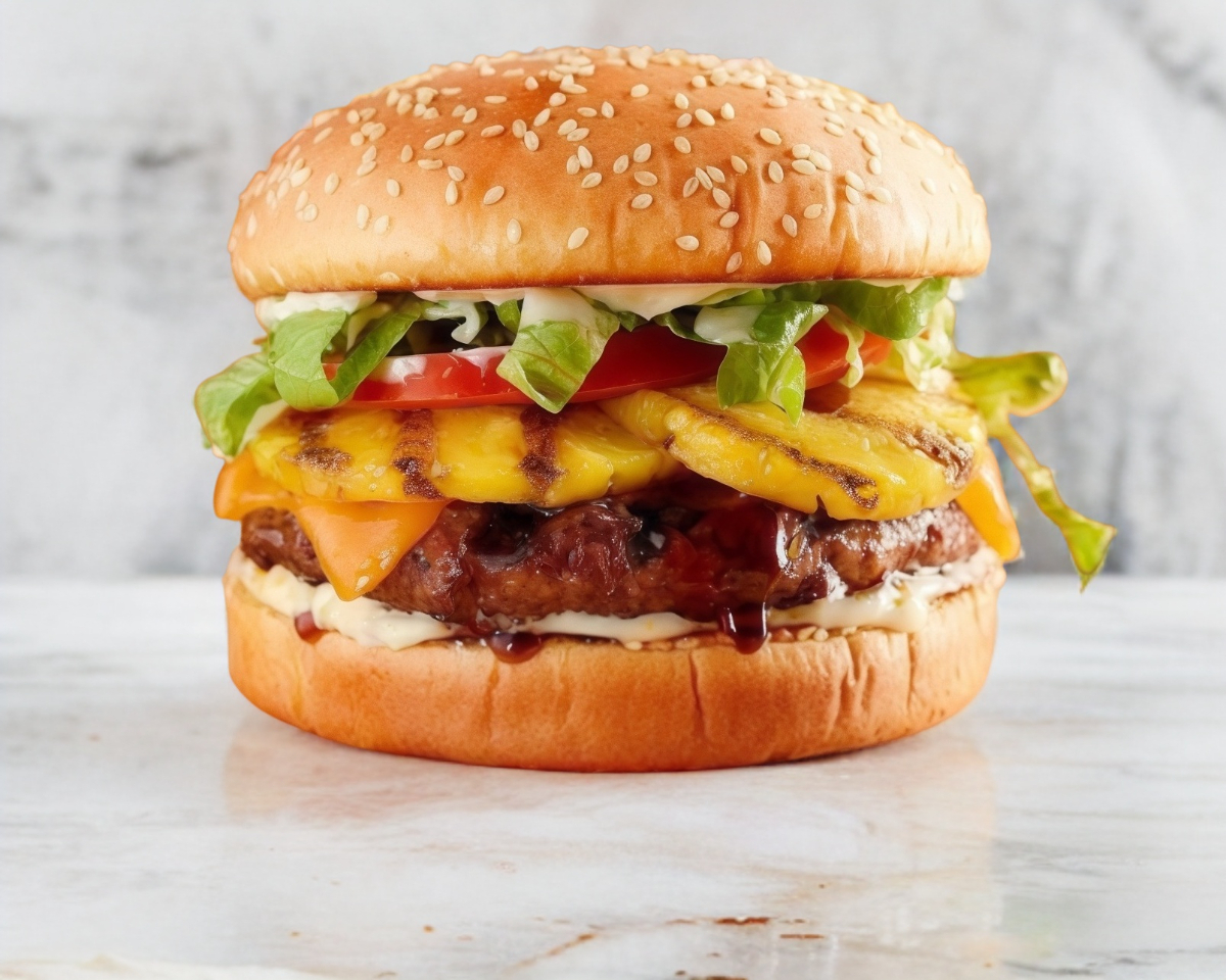 Hamburguesa Estilo Hawaiana, con carne de res, jamón de pavo y piña. Lleva pan artesanal, lechuga, jitomate, cebolla, aderezo y mostaza. ¡Dulce, salada y buenísima!