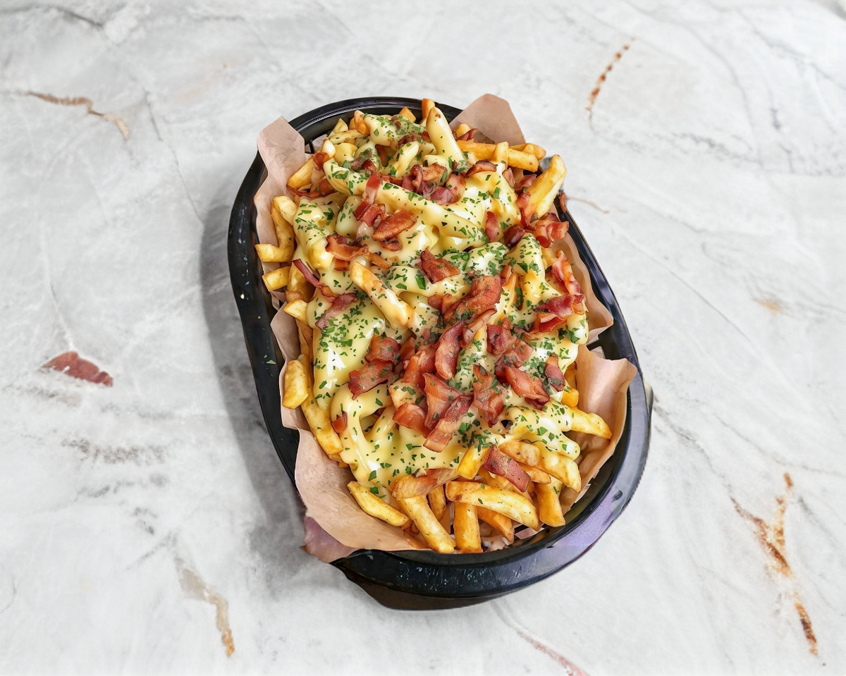 Papas a la francesa artesanales, servidas con crujiente tocino, cebolla caramelizada y jalapeños al toque. Una combinación de sabores intensos y contrastes que elevan lo clásico.