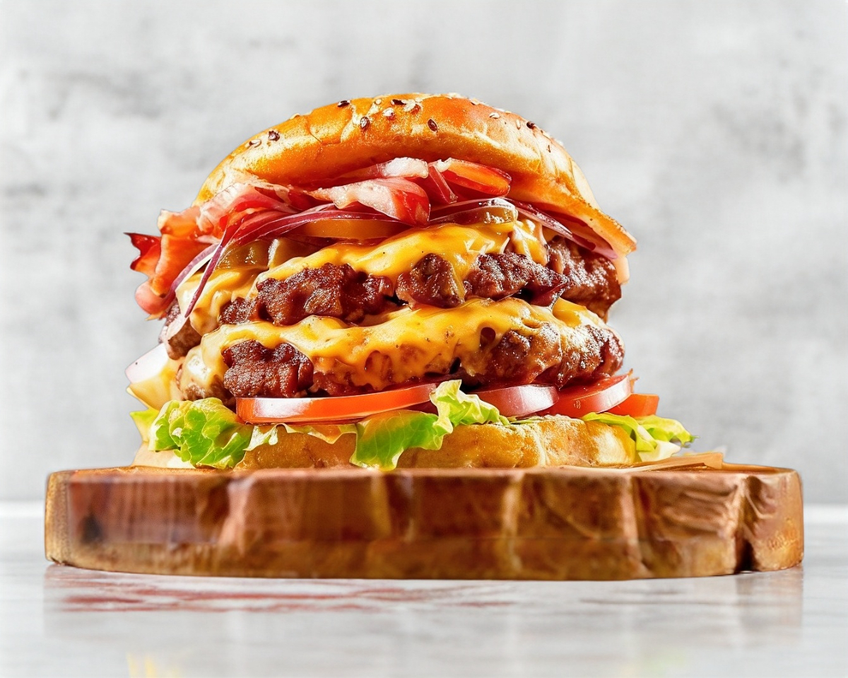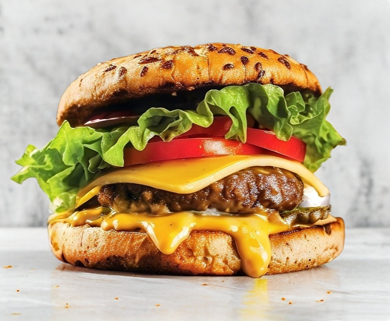 Hamburguesa Doble Pan artesanal, lechuga, jitomate, cebolla, aderezo, mostaza y dos buenas porciones de carne de res. ¡Para los de buen diente!