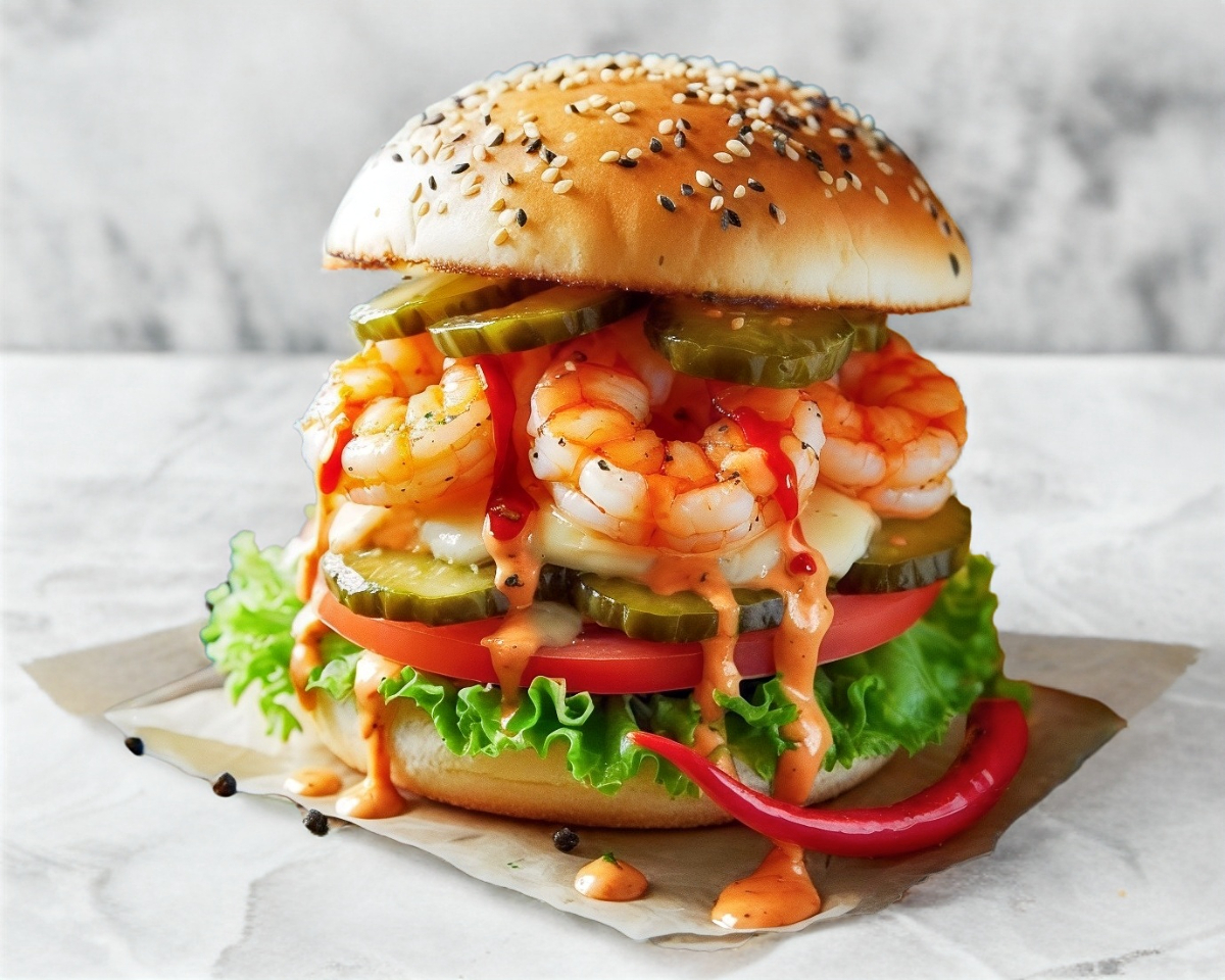 Hamburguesa de Camarón Con pan artesanal suave y doradito, camarones jugosos, lechuga fresca, jitomate, cebolla, aderezo cremoso y un toque de mostaza.