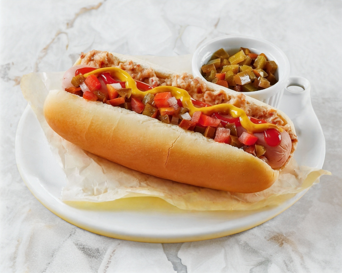 Pan artesanal, salsa mexicana, salchicha de pavo, tocino y aderezo.