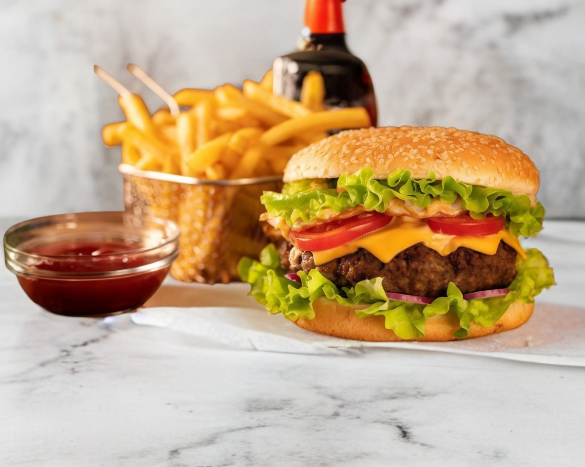 Hamburguesa Tradicional Con pan artesanal, jitomate, cebolla, lechuga, aderezo, mostaza y carne de res crocante, bien sazonada y con un sabor delicioso.
