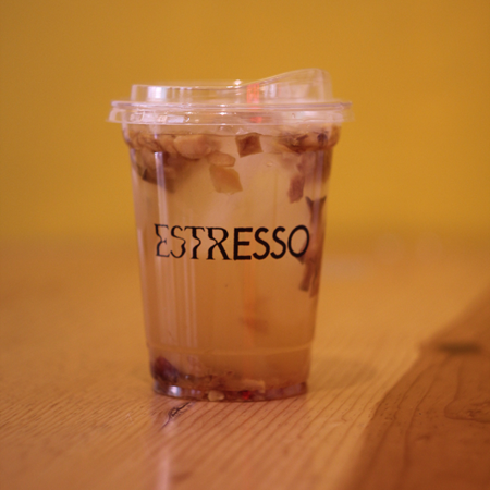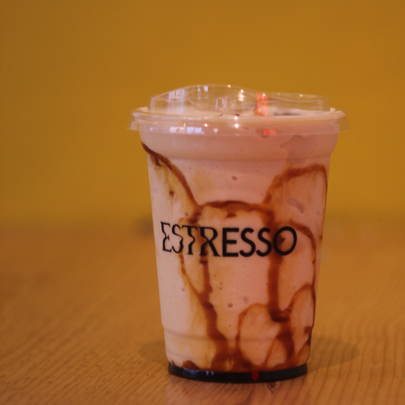 Bebida fría y espumosa a base de café, hielo, preparado con base de helado sin lactosa jarabe a elegir, 16 oz.