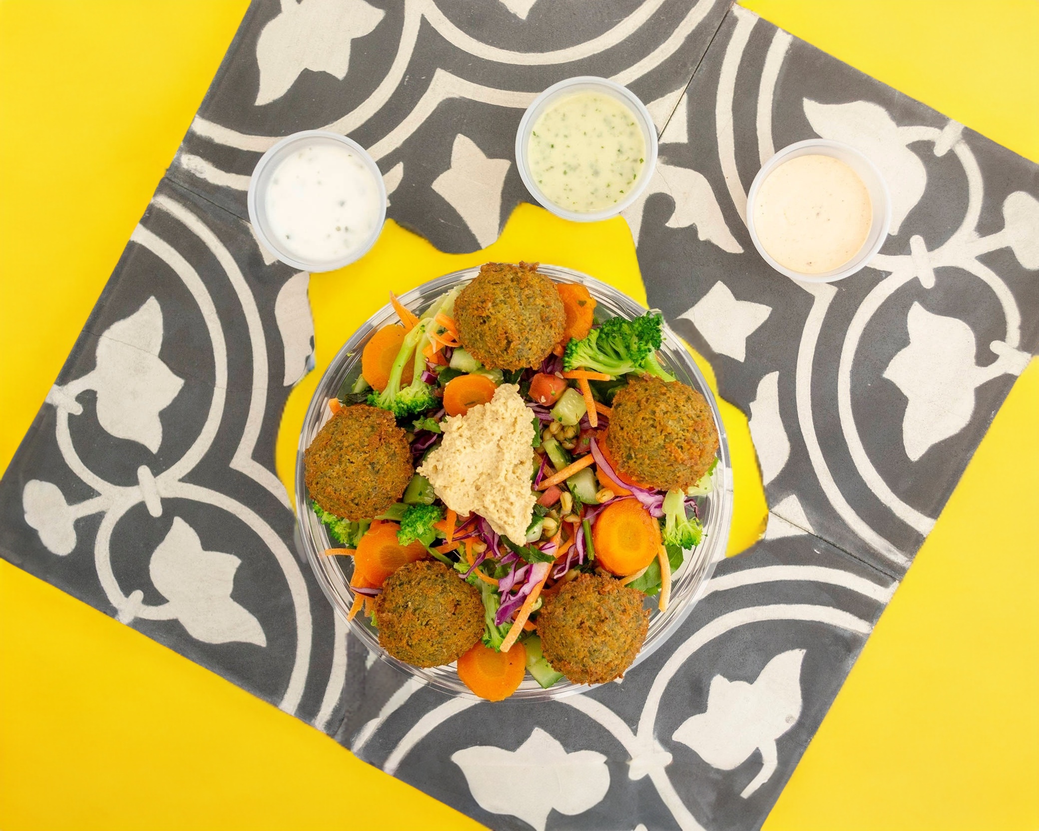Lechugas, vegetales, 5 falafel (croquetas de garbanzo fritas), hummus y aderezo
