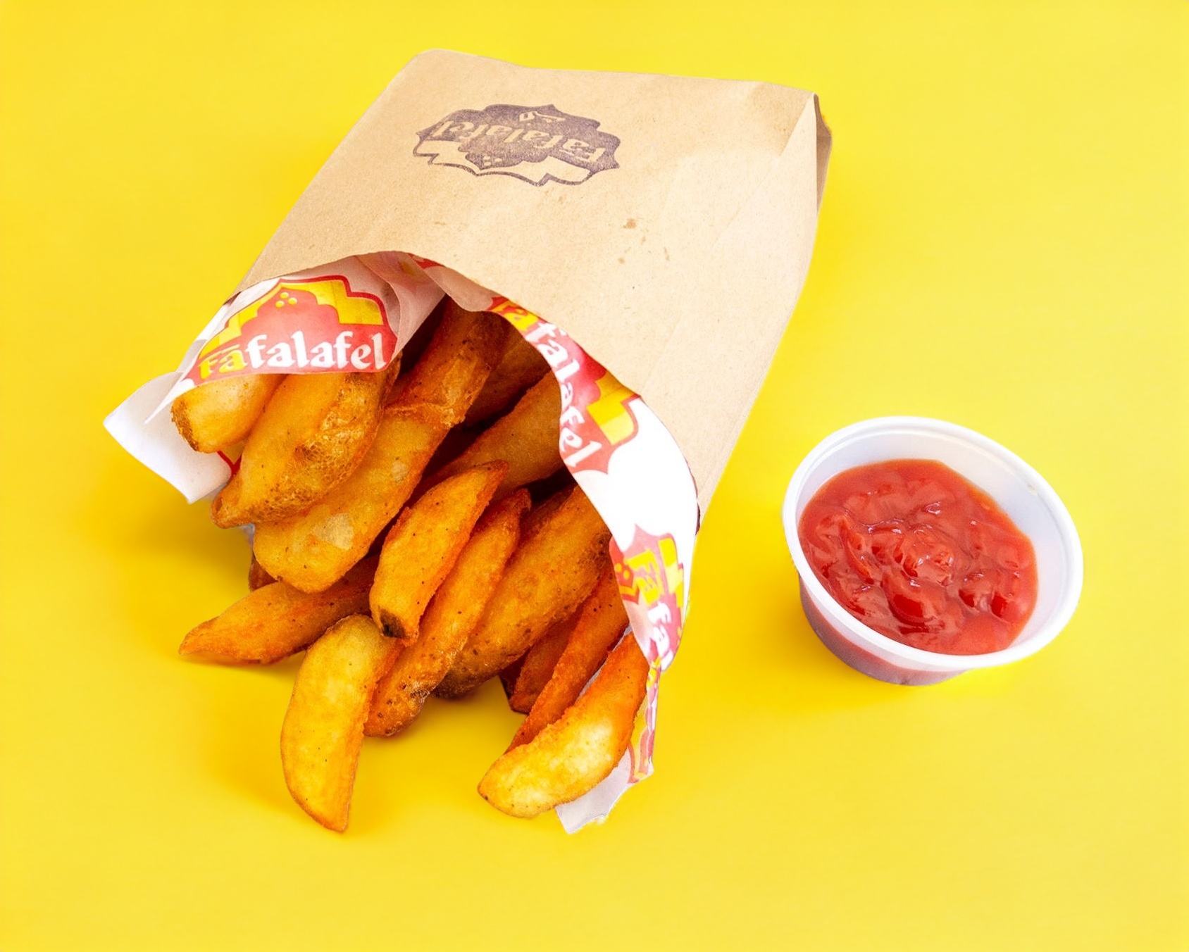 Papas fritas en gajo sazonadas, acompañadas con ketchup