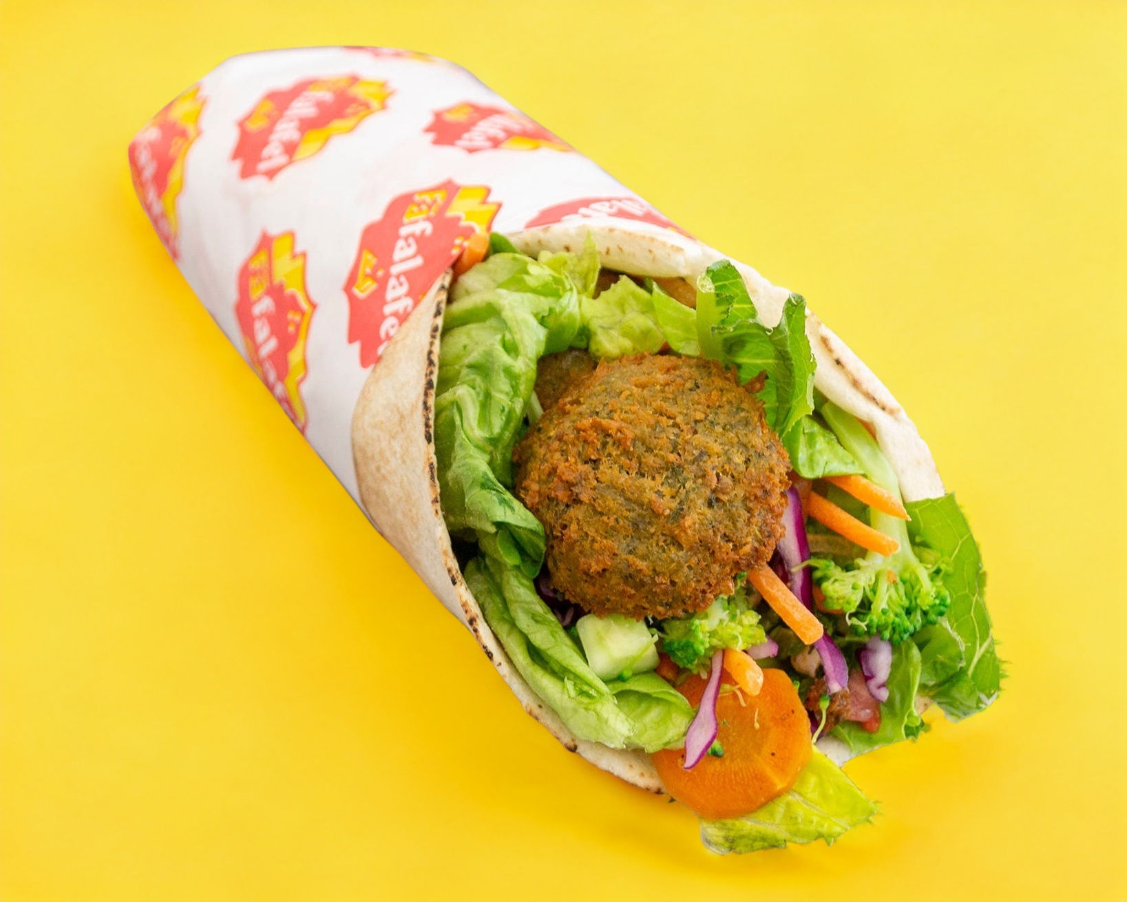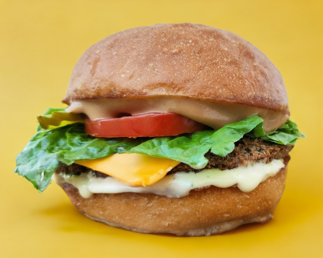 Hamburguesa de falafel con queso americano, lechuga, jitomate, pepinillos, ketchup, mostaza y aderezos especiales.