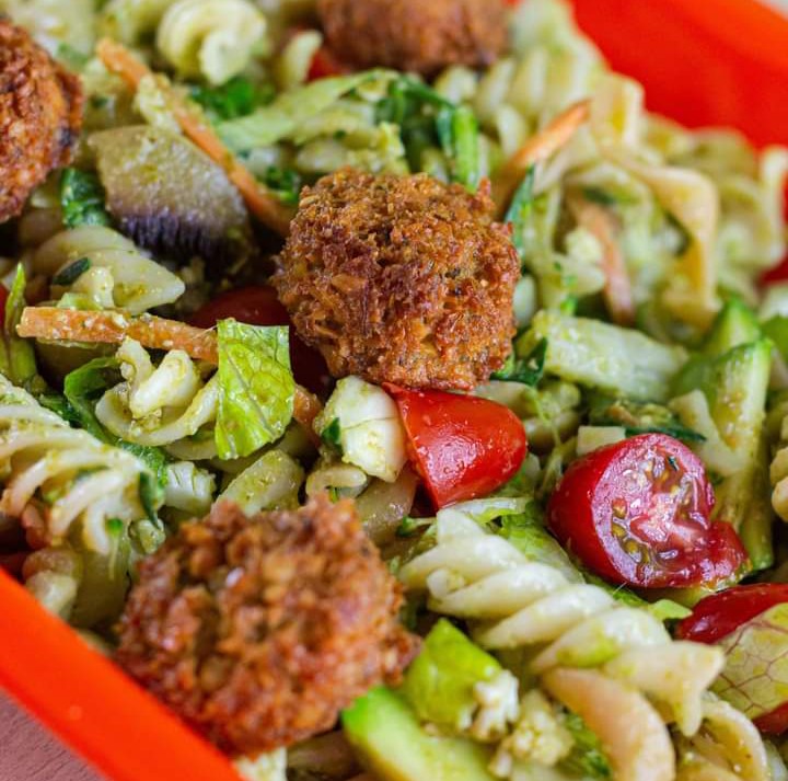 Pasta Fusilli fría Toque de ensalada lechuga con zanahoria, 5 croquetas de falafel mini, Champiñones, Calabacita, Jitomate cherry , Tirita de maíz crocante Y pesto italiano. 100% vegana.