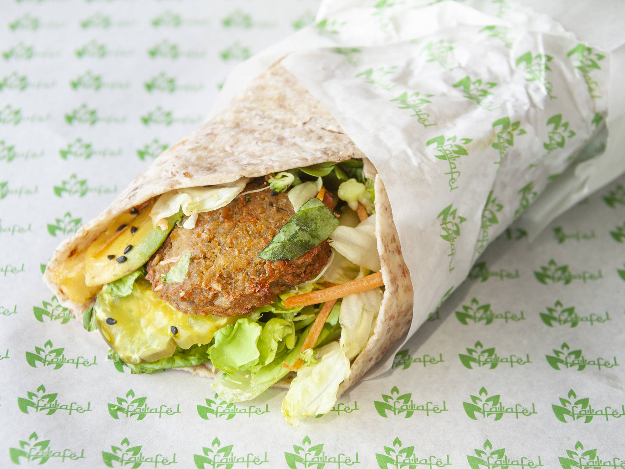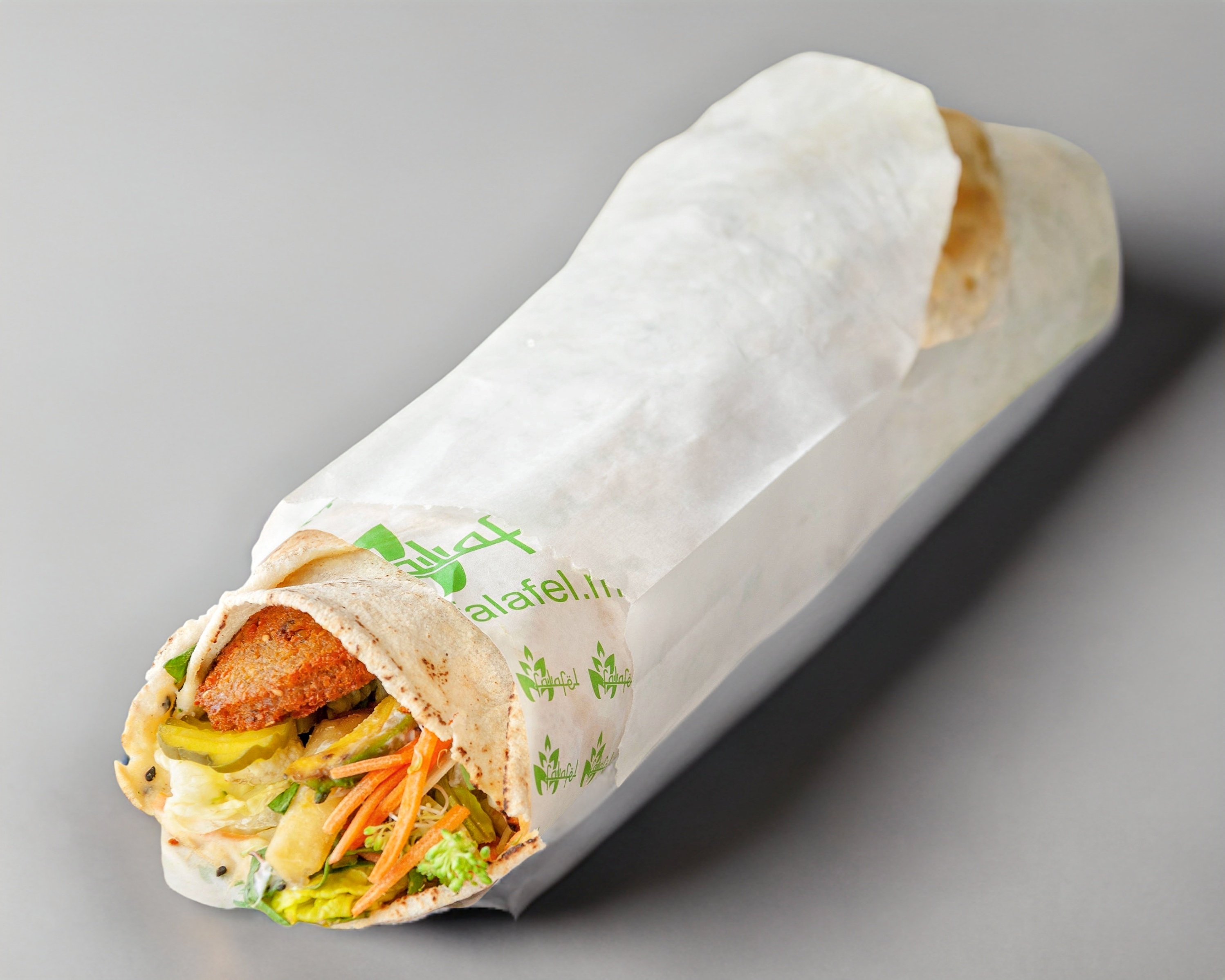 Pan pita relleno de 7 verduras y vegetales, hummus, 3 croquetas de falafel, aguacate, pepinillo, germinado y aderezado con salsa raita.