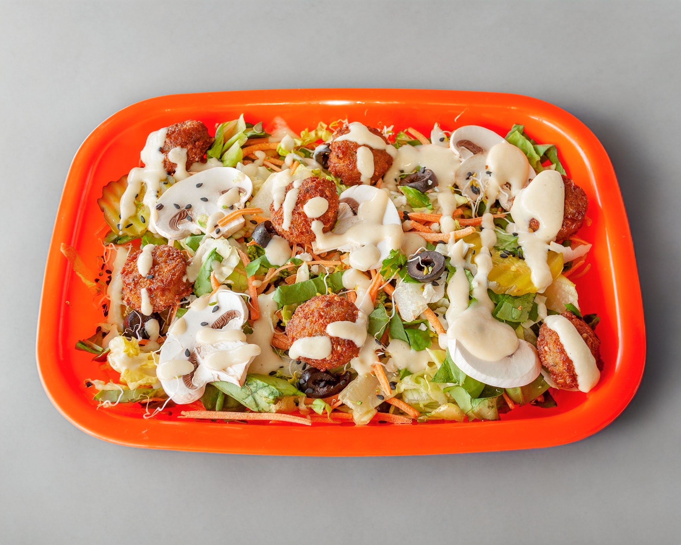 Lechuga fresca, verduras, vegetales, aguacate, champiñones, aceituna negra y croquetas de falafel