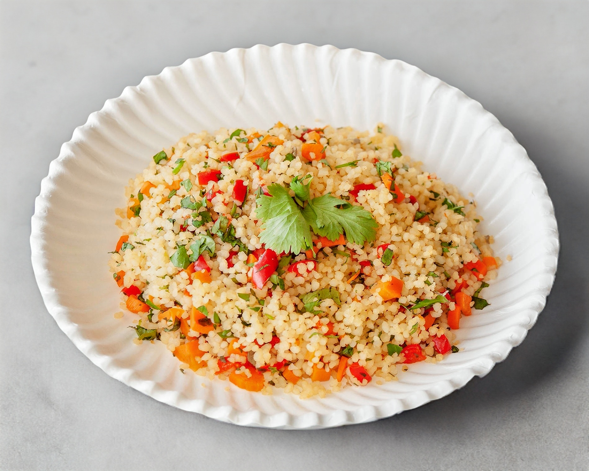 Cous cous hidratado con menta y combinado con verduras, limón, sal y pimienta