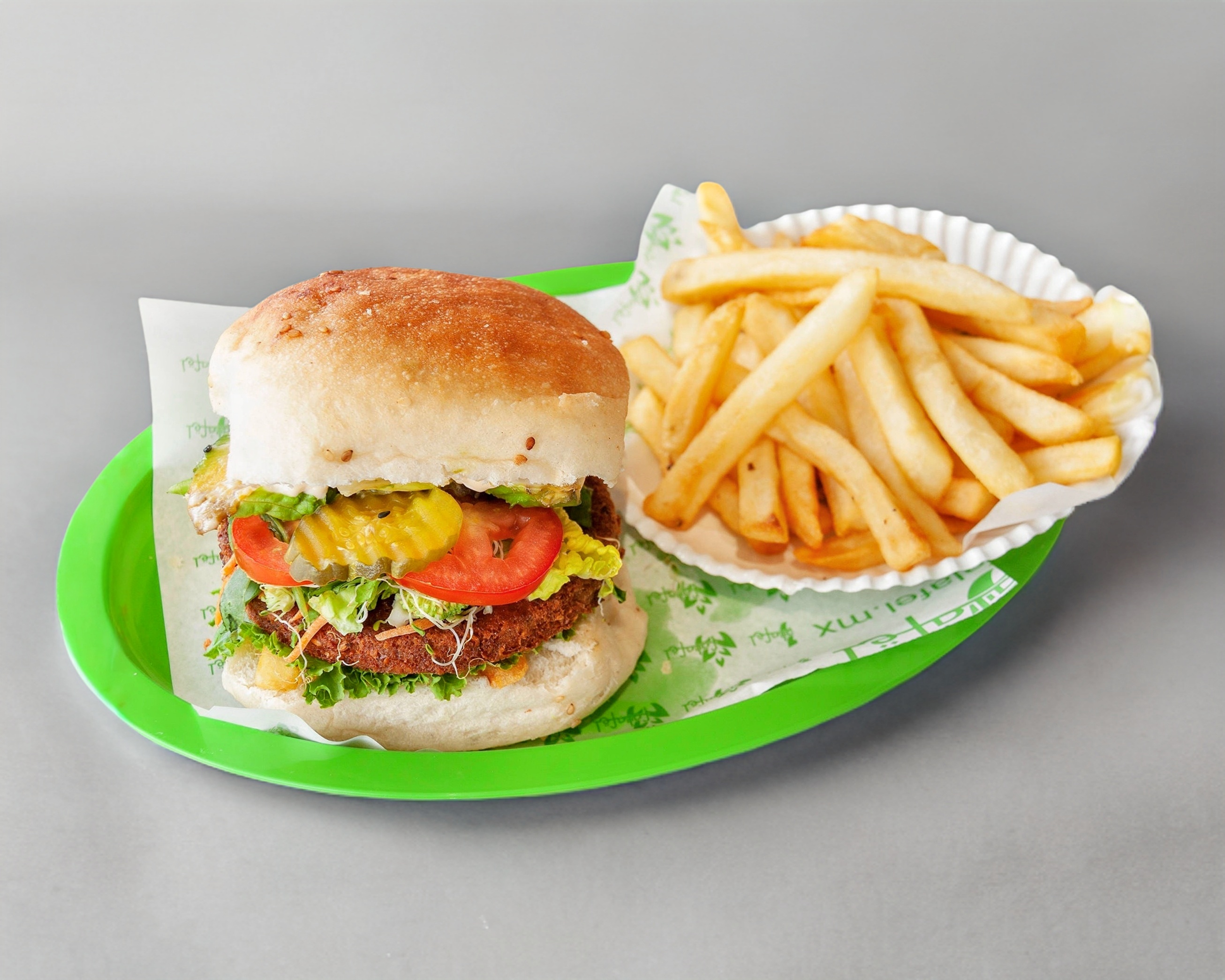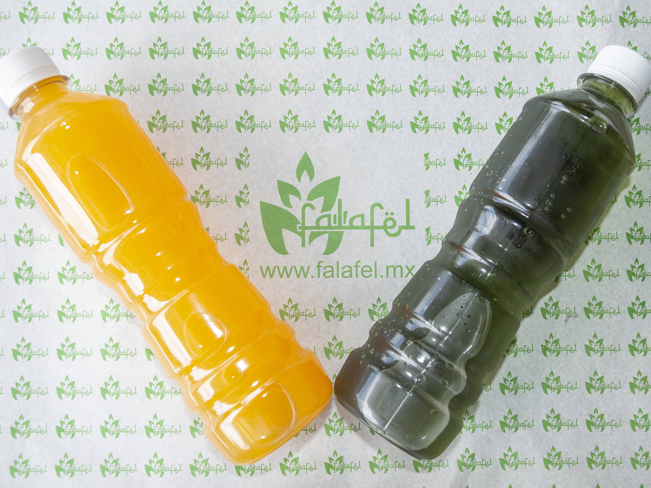 1 Bollo Vegano, mostaza, hummus, tahini, concreta falafel, lechuga, verduras, germinado, aguacate, jitomate y pepinillo