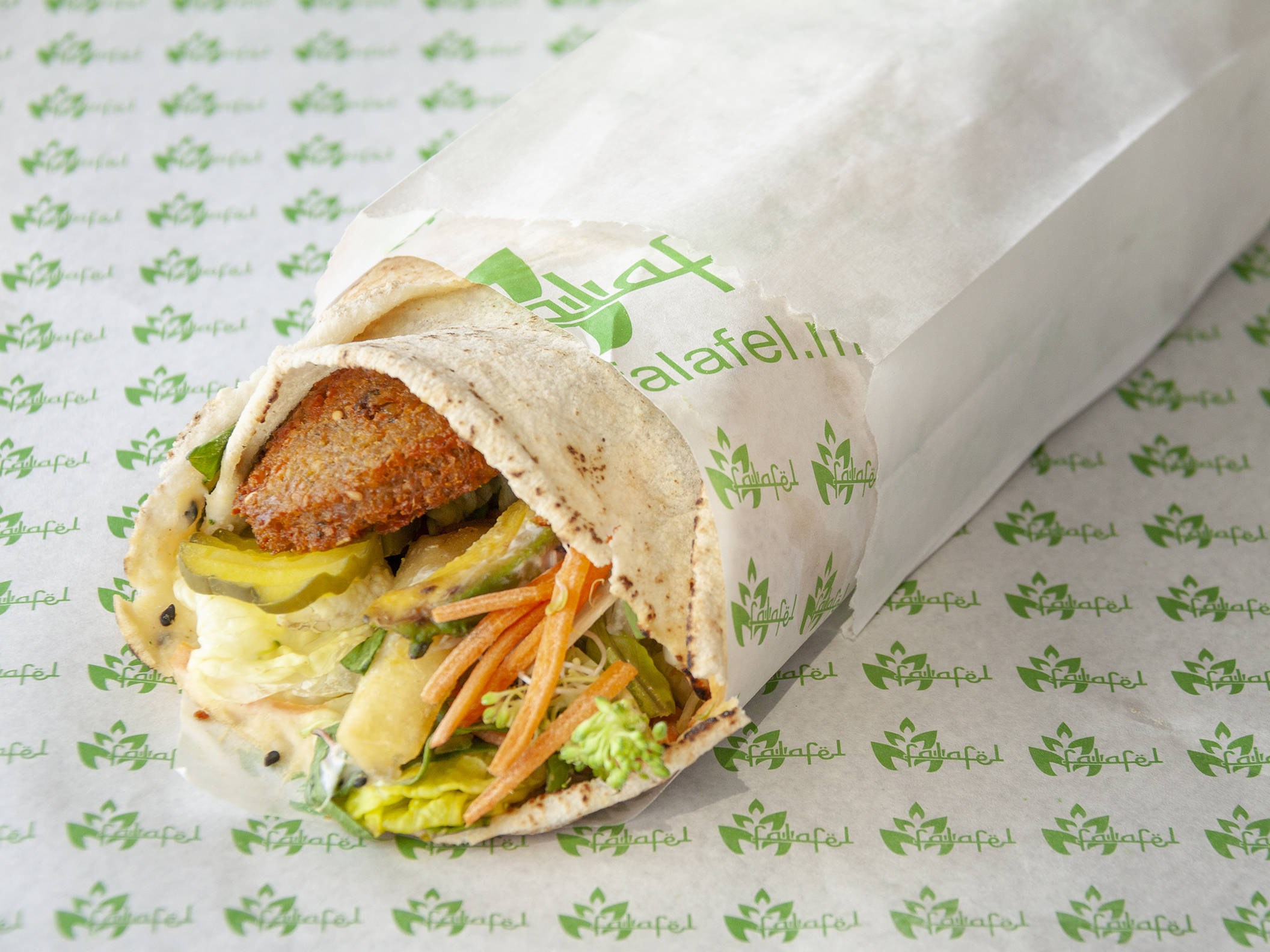Pan pita relleno de 7 verduras y vegetales, hummus, 3 croquetas de falafel, aguacate, pepinillo, germinado y aderezado con hummus.