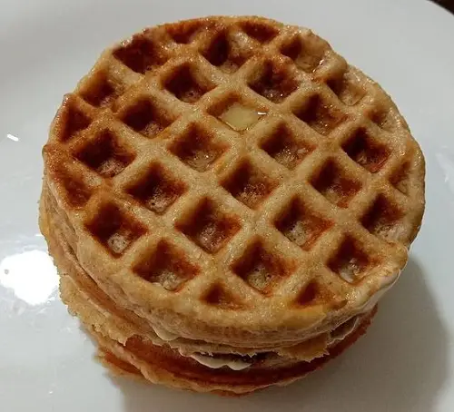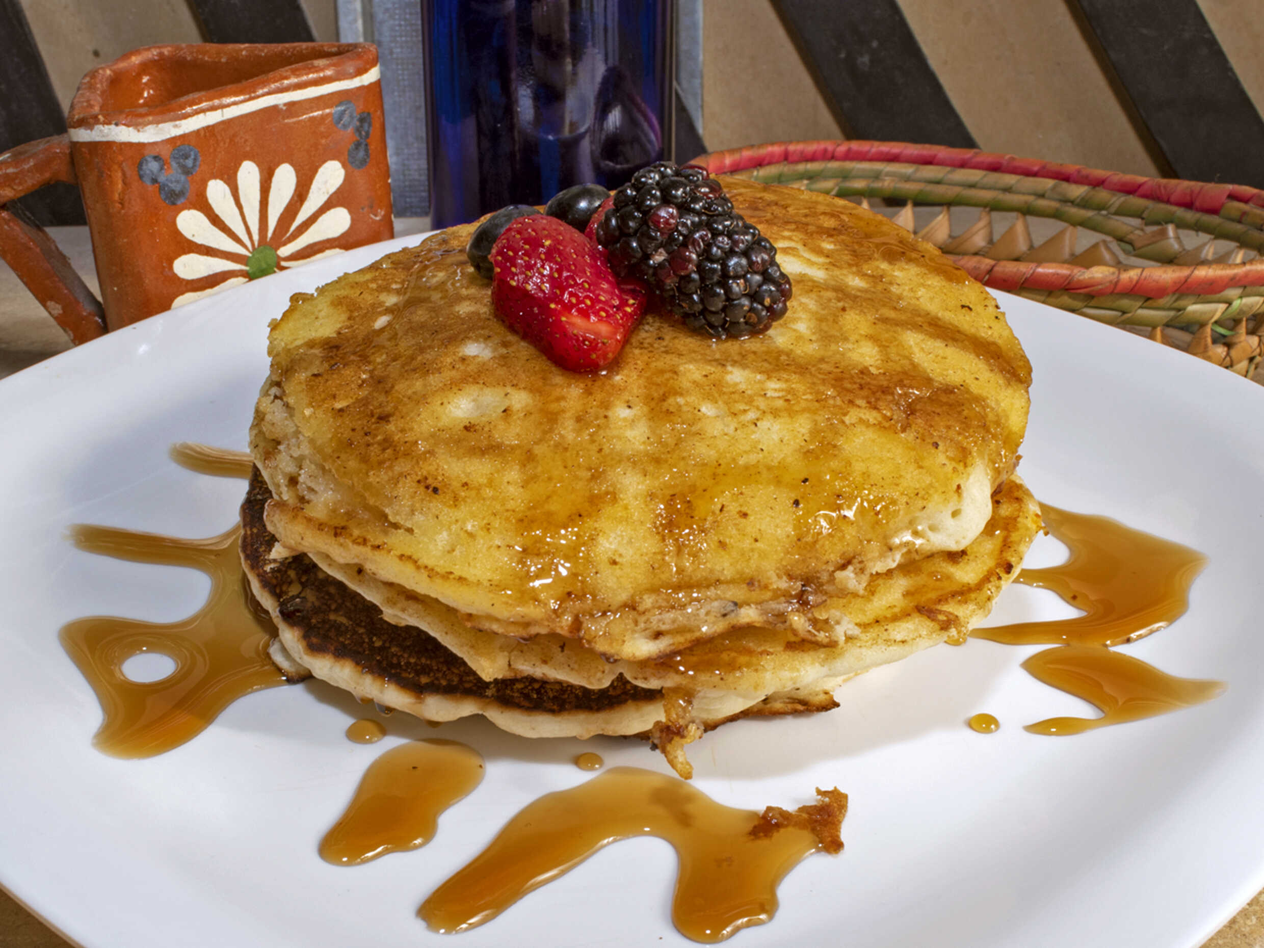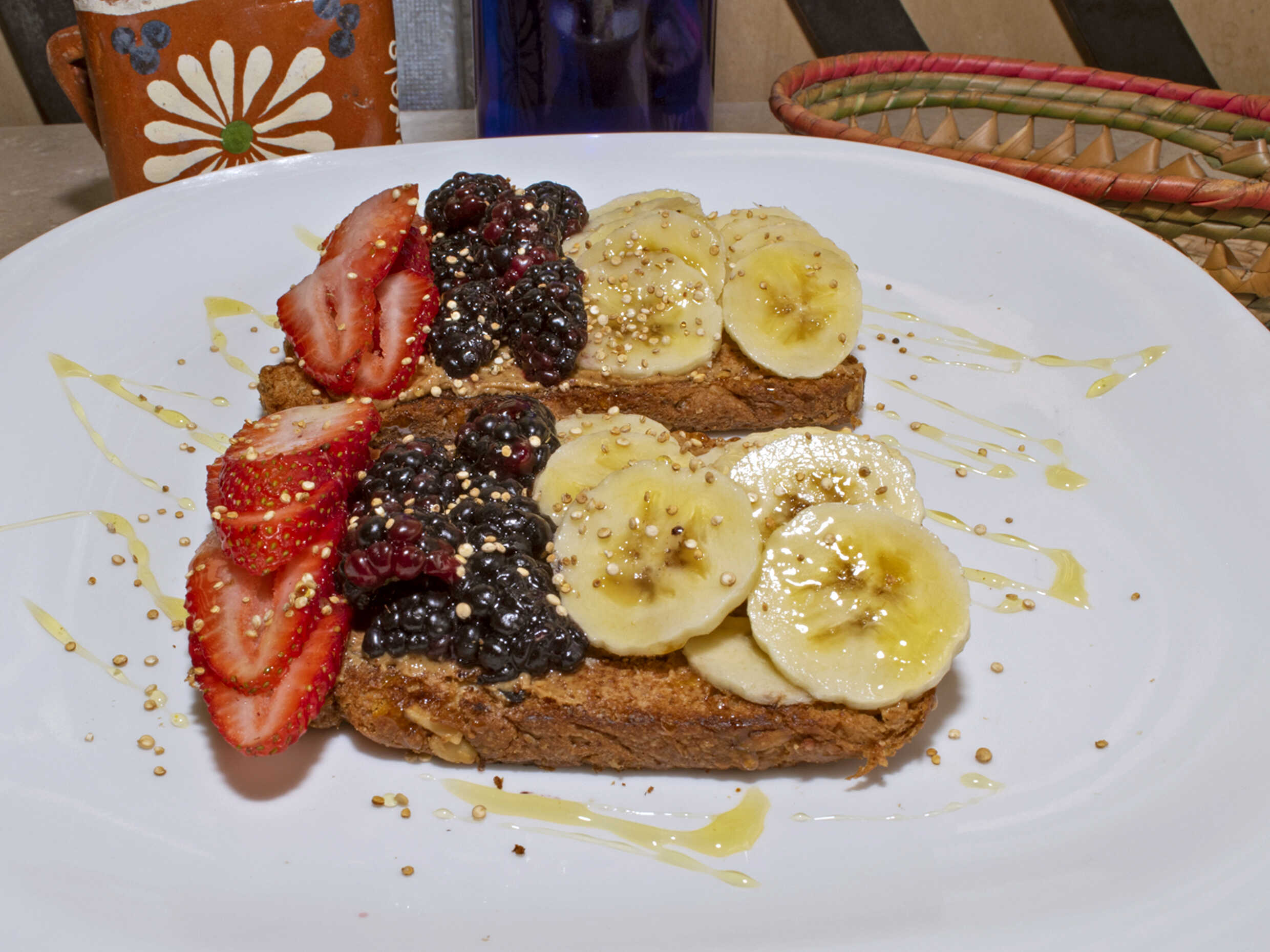 Pan envuelto el huevo a la plancha con mantequilla, acompañado de frutos rojos.