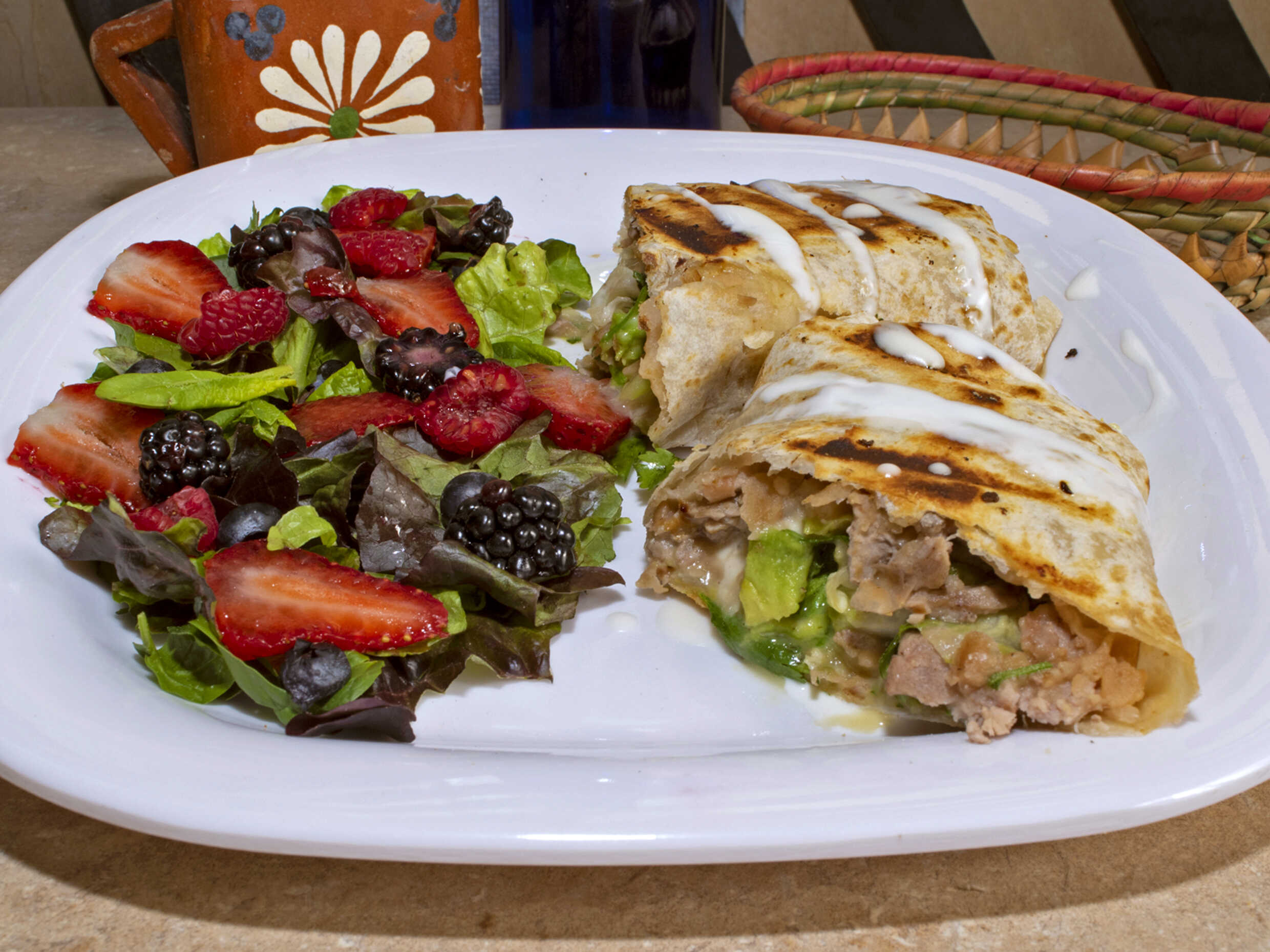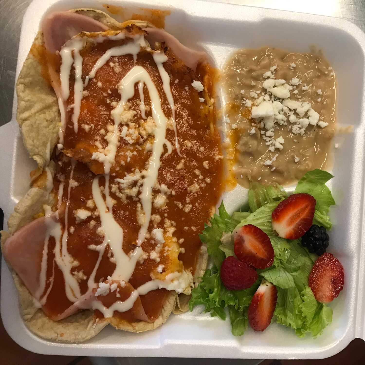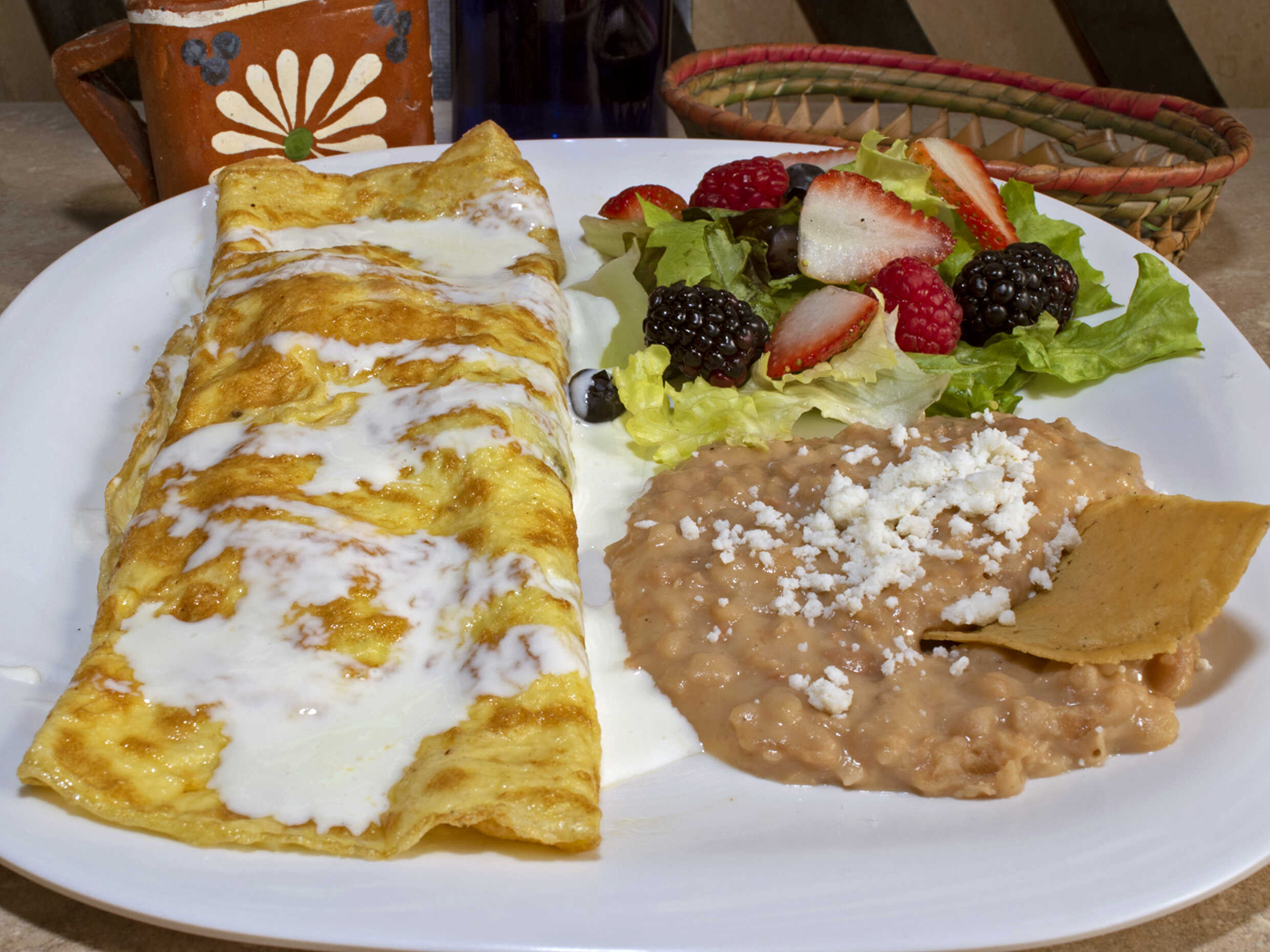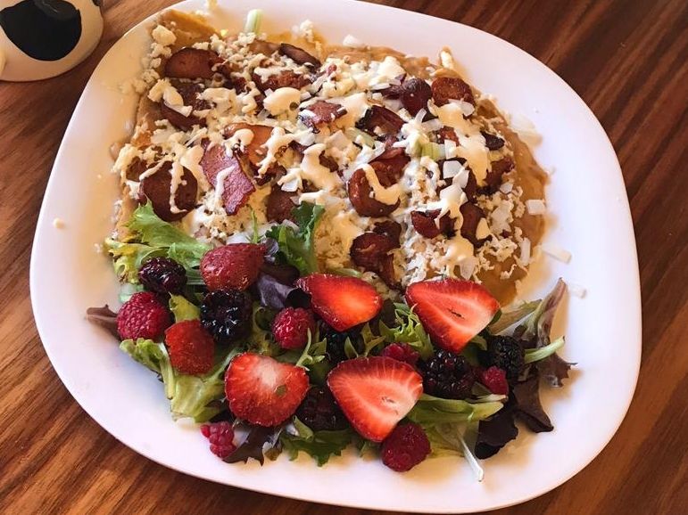 Orden de 4 enfrijoladas con tocino y chorizo, crema, queso, cebolla, acompañado con ensalada de frutos rojos.