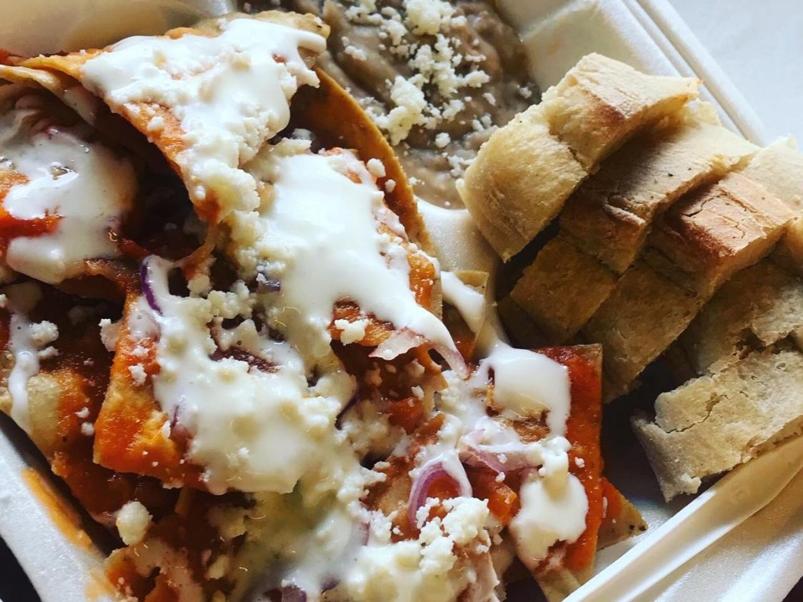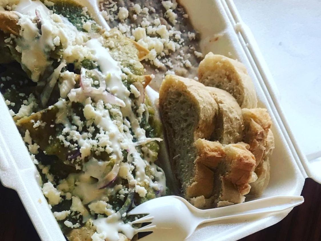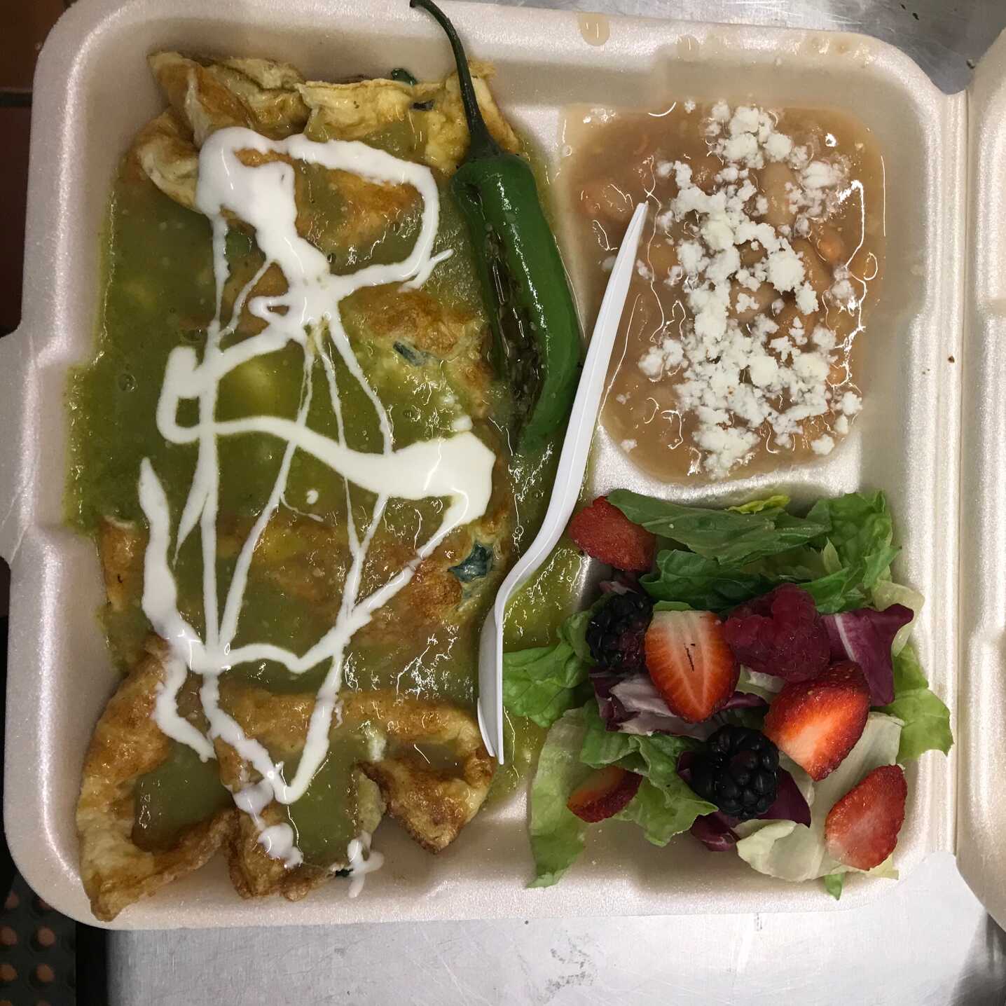 Orden de 4 enfrijoladas con tocino y chorizo, crema, queso, cebolla, acompañado con ensalada de frutos rojos.