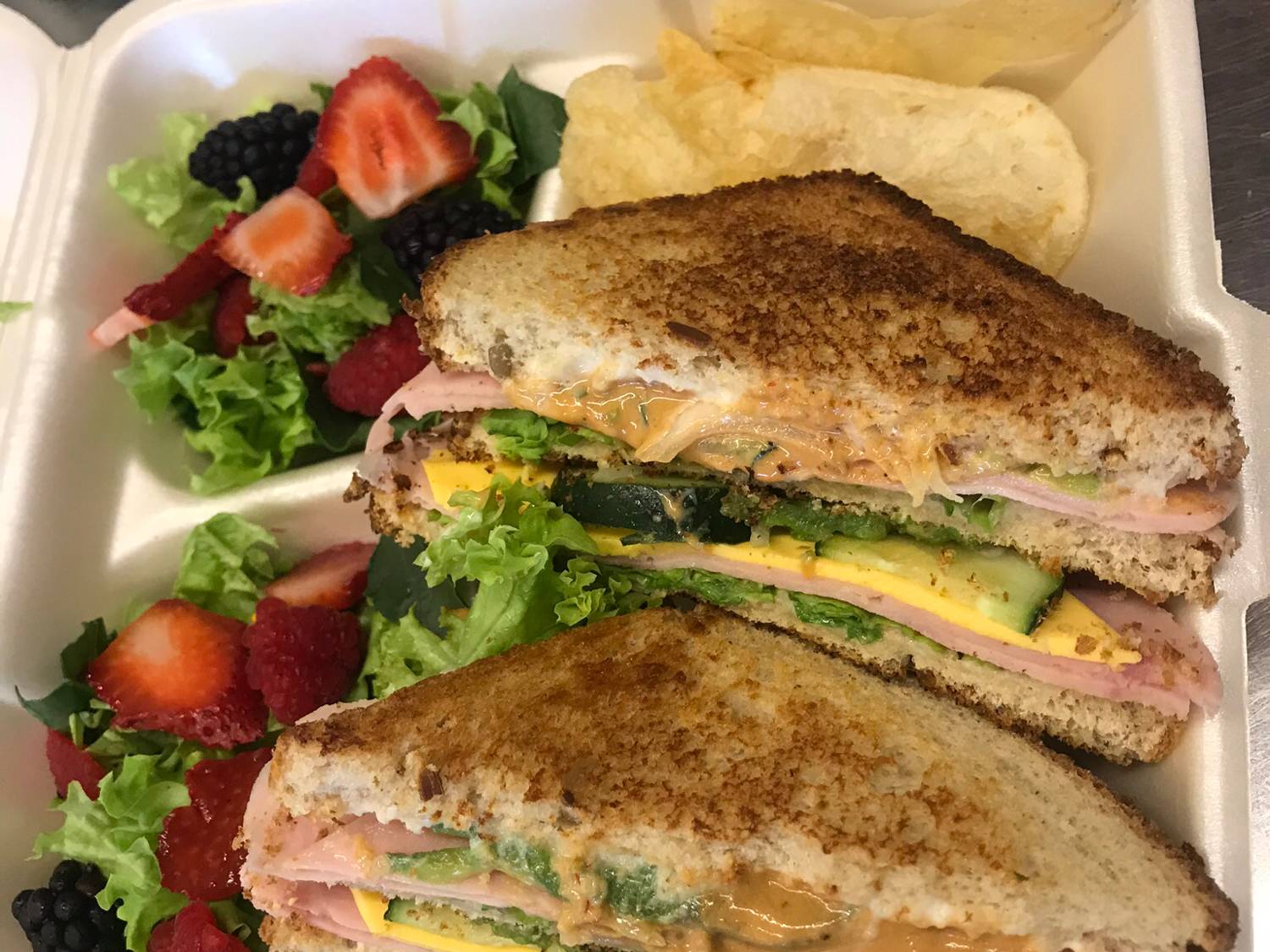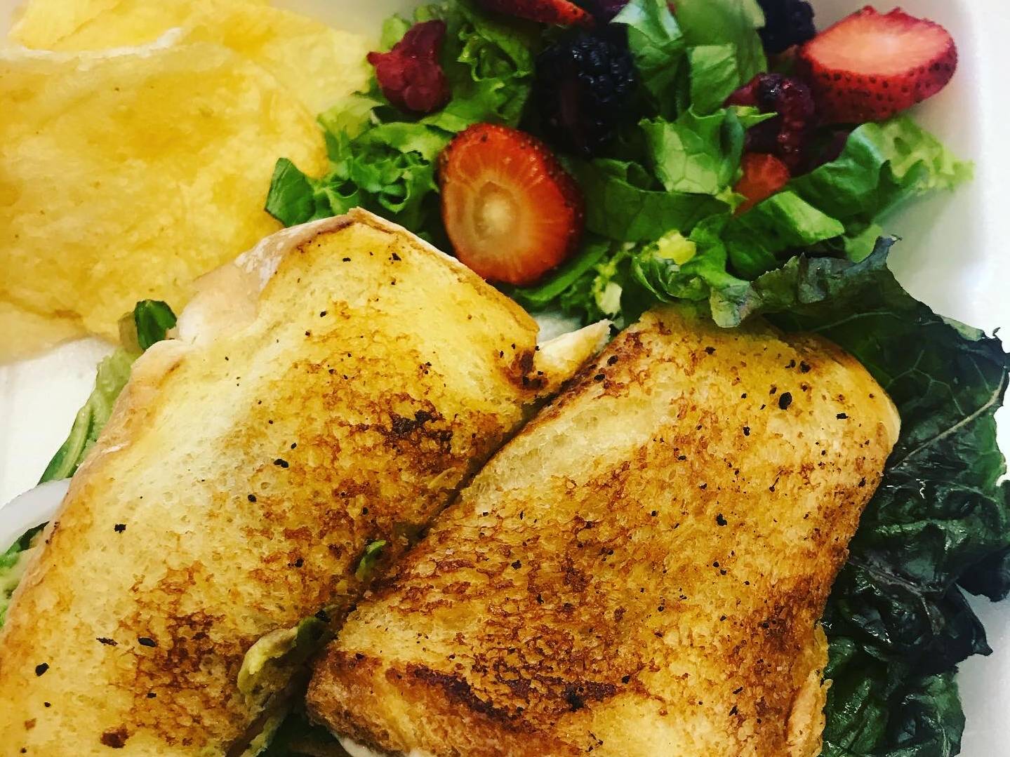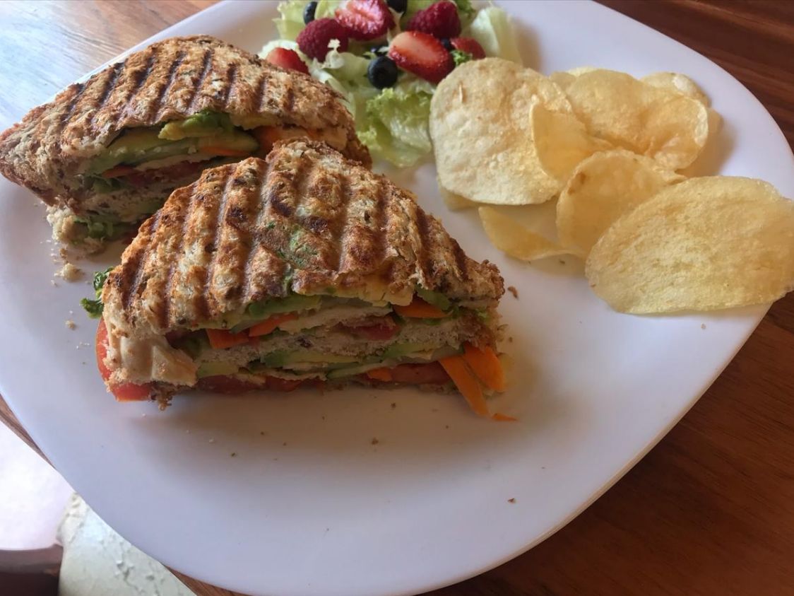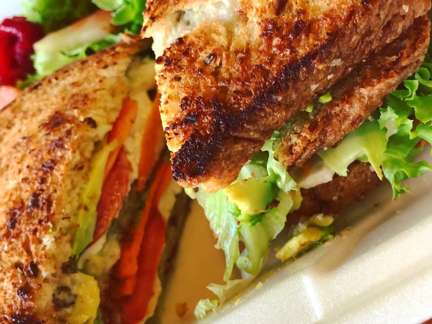 Sándwich preparado al momento, con pan integral, crema, lechuga, zanahoria, pepino, jitomate, cebolla morada y aguacate, acompañado de ensalada con papas fritas, con opción de doble ensalada.