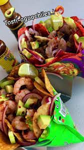Deliciosos aguachile con una gran variedad de mariscos bañados con la salsa de la casa, pepino y cebolla morada, montado sobre una cama de tostitos.
