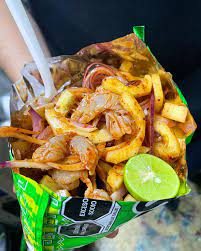 Aguachile de camarón bañado en la salsa de la casa, mango, pepino y cebolla morada, montado sobre una cama de tostitos.